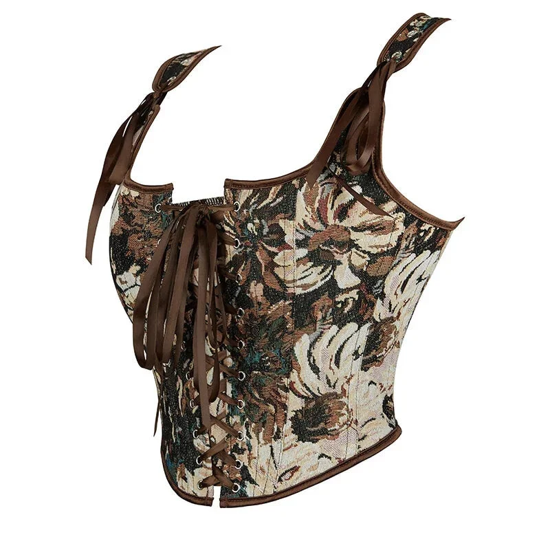 Brown Steampunk Corset With Front Busk Closure Floral Lace And Puff Sleeves - Green - Xxl