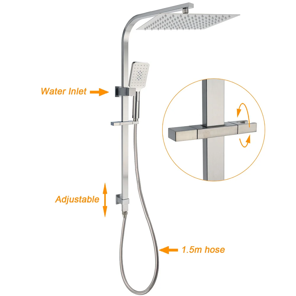 - Materials: Stainless steel in rail, stainless steel in shower holder, brass in diverter