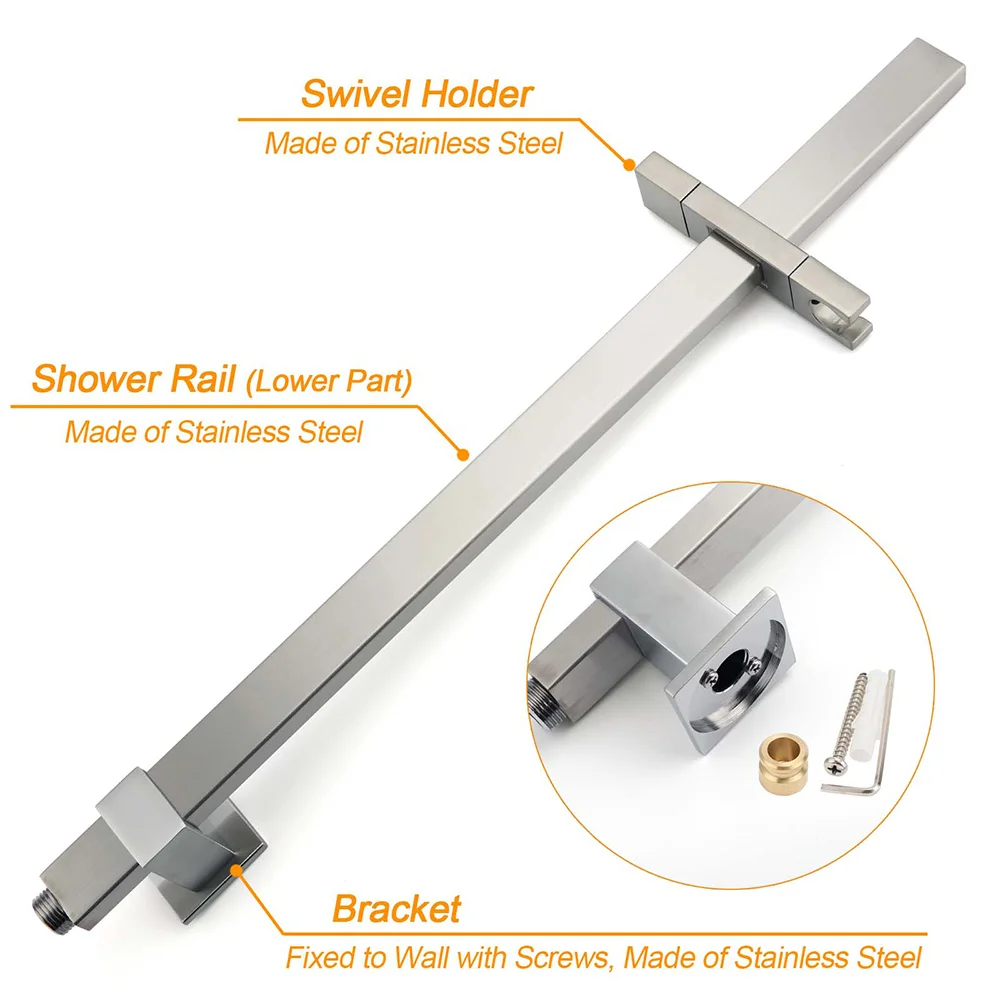 - Materials: Stainless steel in rail, stainless steel in shower holder, brass in diverter
