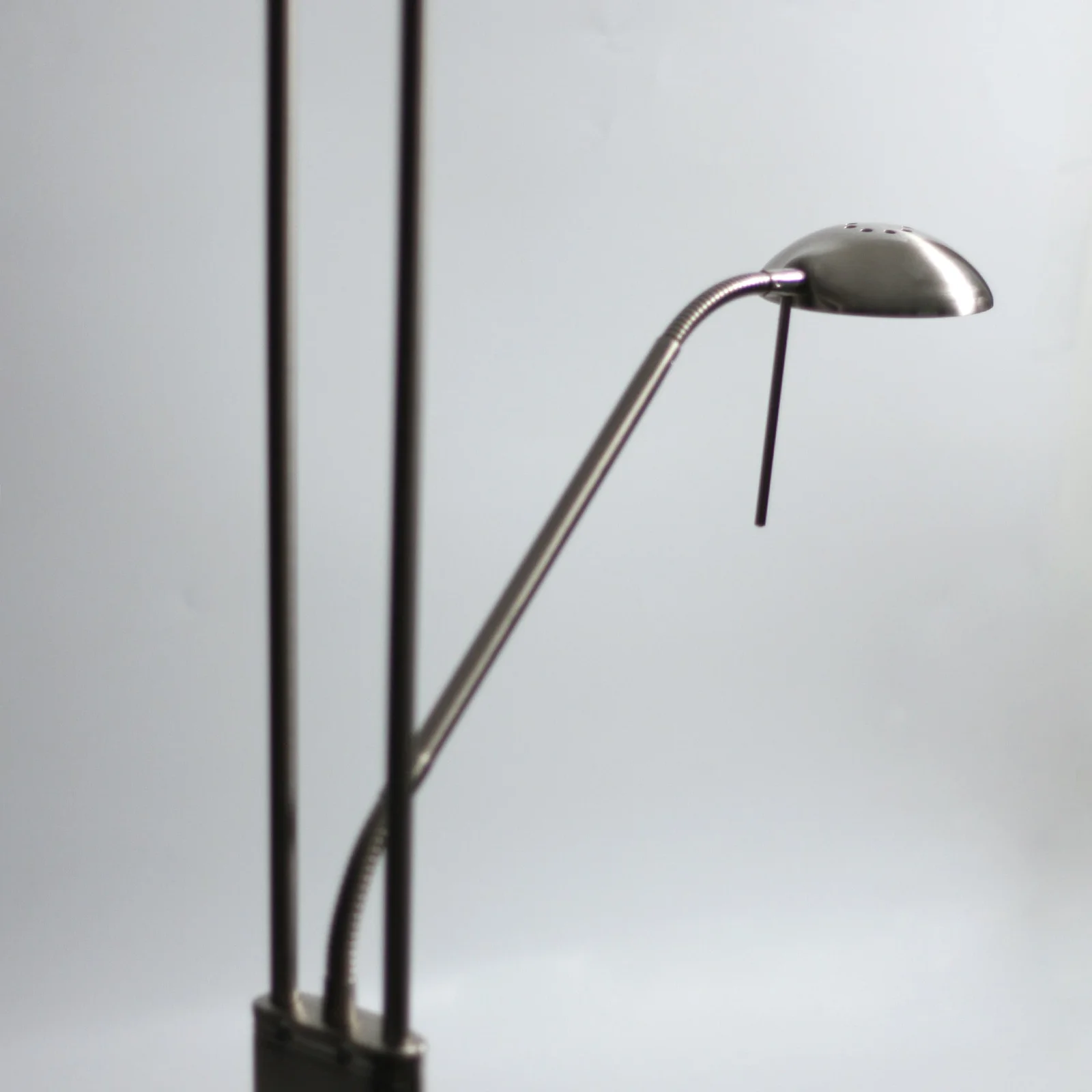 The mother child description refers to the two LED lights within the lamp. The mother lamp is the light on top of the lamp, giving general or ambience lighting with its dimmable function, while the child lamp is an adjustable reading light that sits halfway up the lamp's stand.