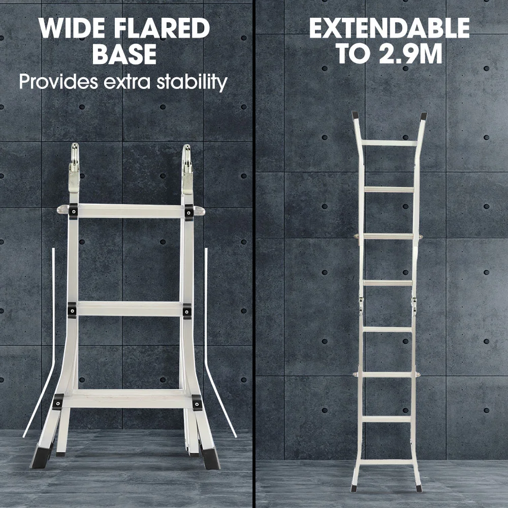 Navigate challenging terrains effortlessly; the ladder accommodates uneven surfaces, including stairs, enabling you to access hard-to-reach spots with ease. Crafted from anodized aluminium, it combines durability with a lightweight design of just 10kg, facilitating convenient transportation and setup.When your work is done, the ladder effortlessly folds away, taking up minimal space in your storage area.