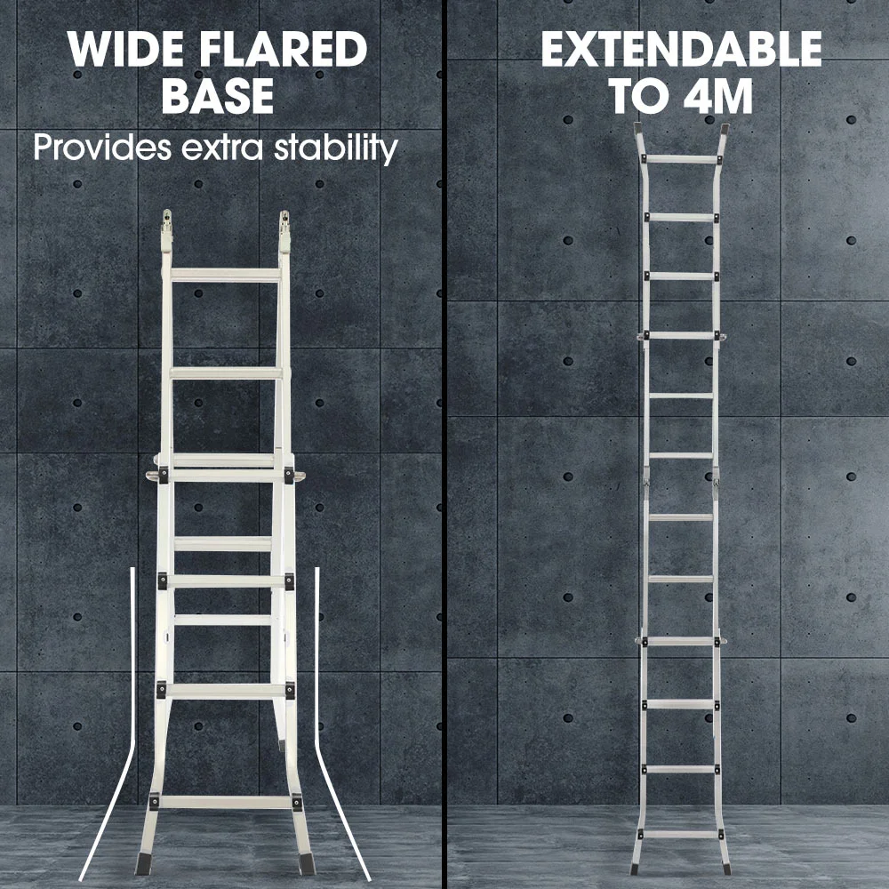 Navigate challenging terrains effortlessly; the ladder accommodates uneven surfaces, including stairs, enabling you to access hard-to-reach spots with ease. Crafted from anodized aluminium, it combines durability with a lightweight design of just 12kg, facilitating convenient transportation and setup. When your work is done, the ladder effortlessly folds away, taking up minimal space in your storage area.