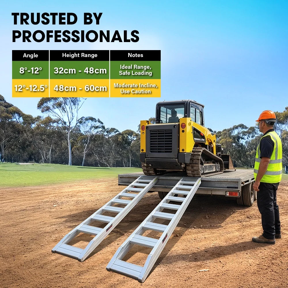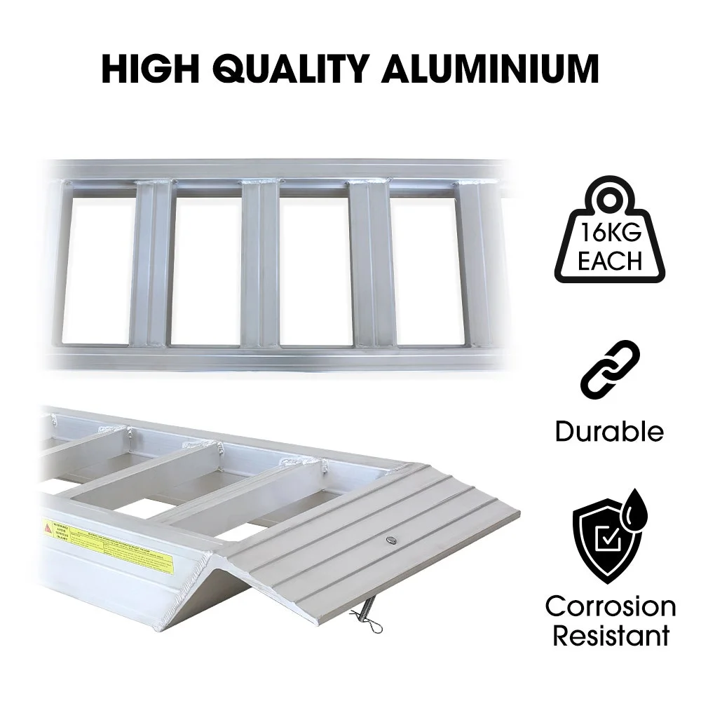 Built for strength, safety and everyday reliability, these Bullet Pro 2.3m Aluminium Loading Ramps deliver outstanding performance for ATVs, landscaping machines and light industrial equipment. The ramp uses a durable extruded aluminium box section frame with 2.5mm side rails and 1.5mm rung thickness. It provides lasting rigidity without unnecessary weight.