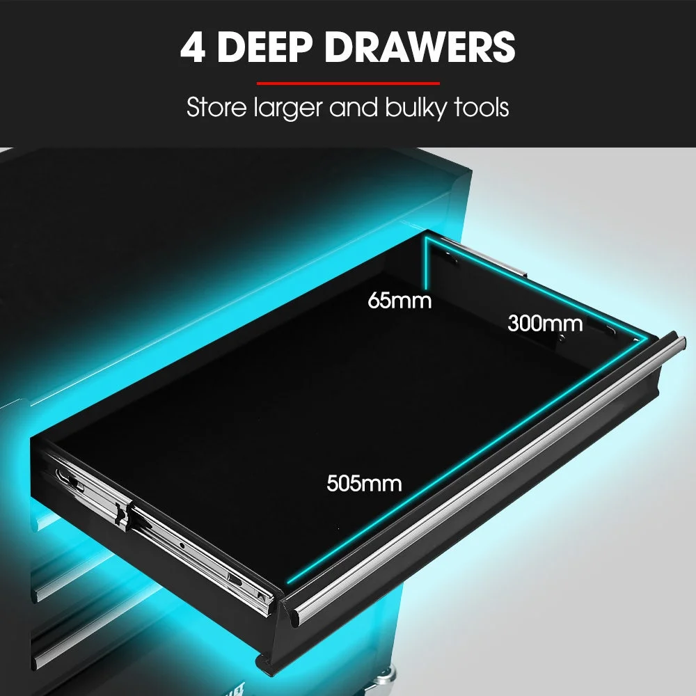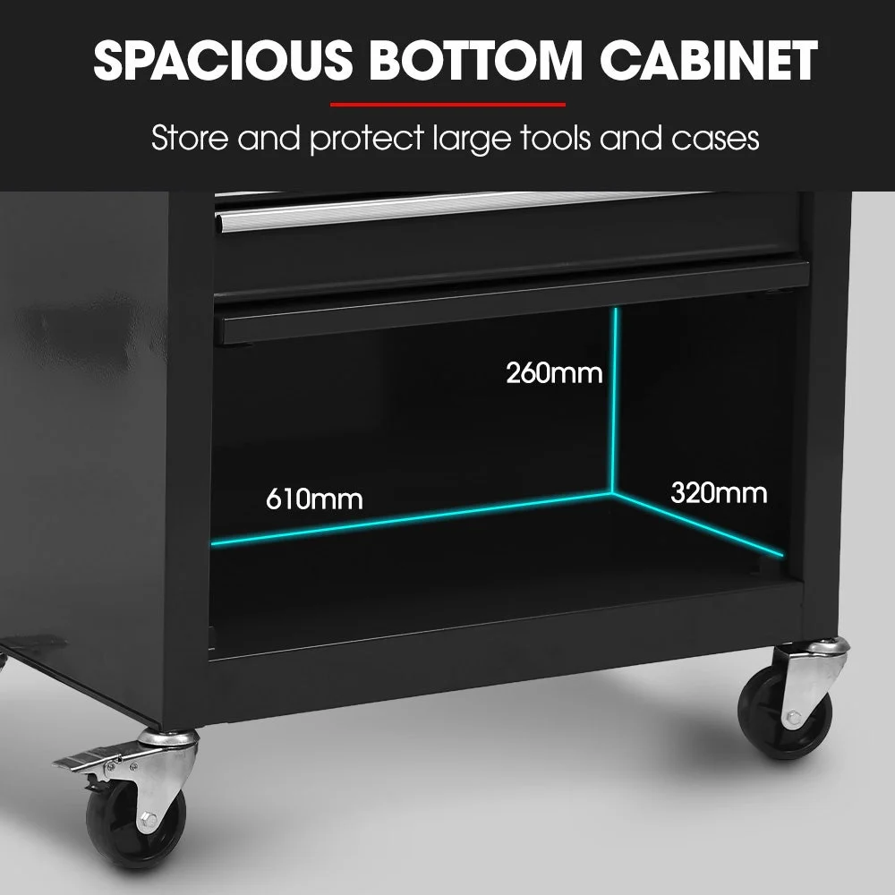 This toolbox features a lower cabinet, which is suitable for bulkier tools. Each drawer is equipped with an EVA mat and it slides effortlessly in and out on smooth ball bearing rails.