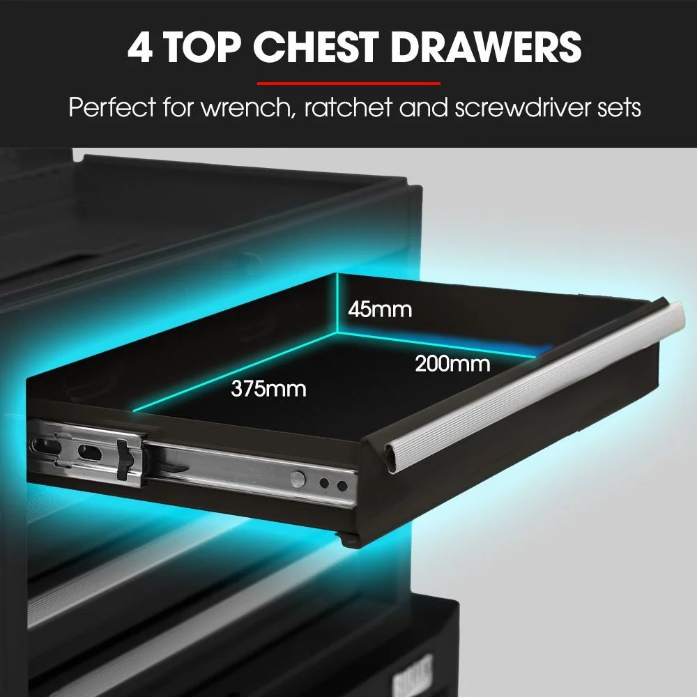 Both the cabinet and chest are built with high tensile powder coated steel enclosures. Equipped with an EVA mat, each drawer slides effortlessly in and out on smooth ball bearing rails, which makes finding and accessing each tool a cinch. The cabinet also comes with 3 pegs and the chest is easily transportable thanks to its side carry handles.