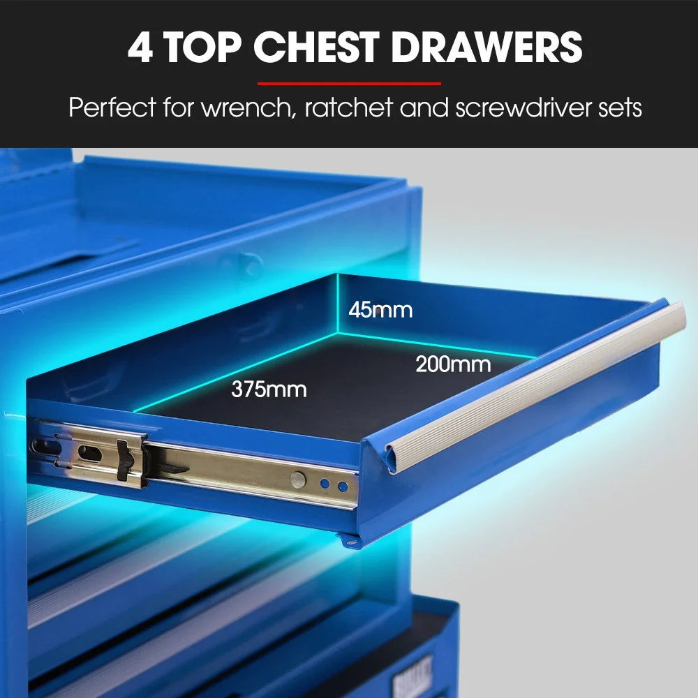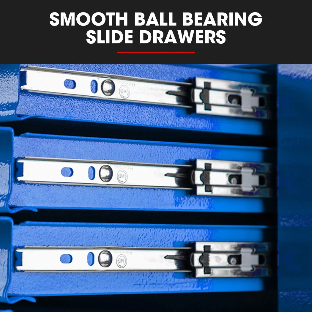 Both the cabinet and chest are built with high tensile powder coated steel enclosures. Equipped with an EVA mat, each drawer slides effortlessly in and out on smooth ball bearing rails, which makes finding and accessing each tool a cinch. The cabinet also comes with 3 pegs and the chest is easily transportable thanks to its side carry handles.