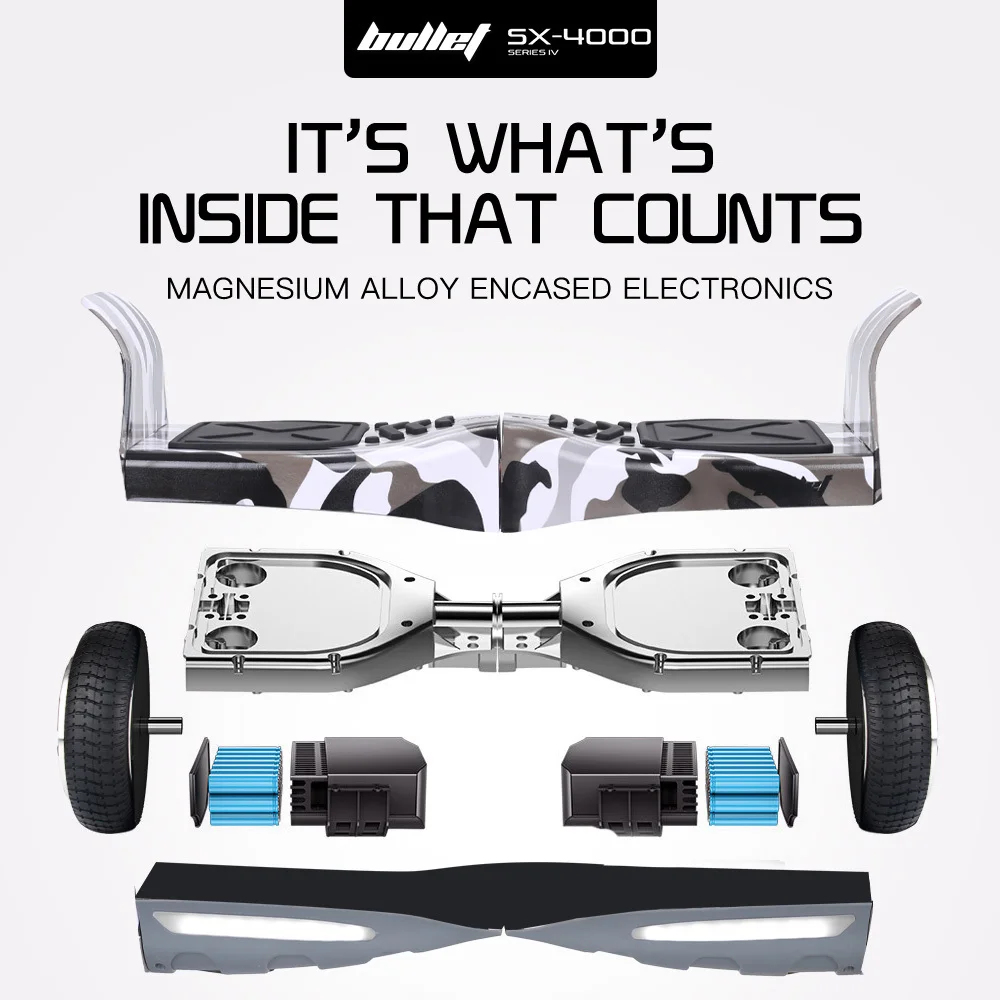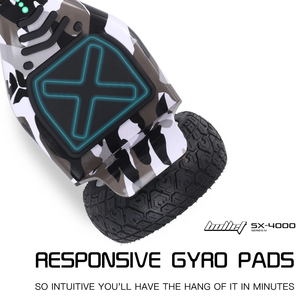 Experience a next level hoverboard with the state-of-the-art Bullet SX-4000. Its high-speed chipset reacts instantly to your bodys movements, offering highly responsive acceleration, turning, and reversing.