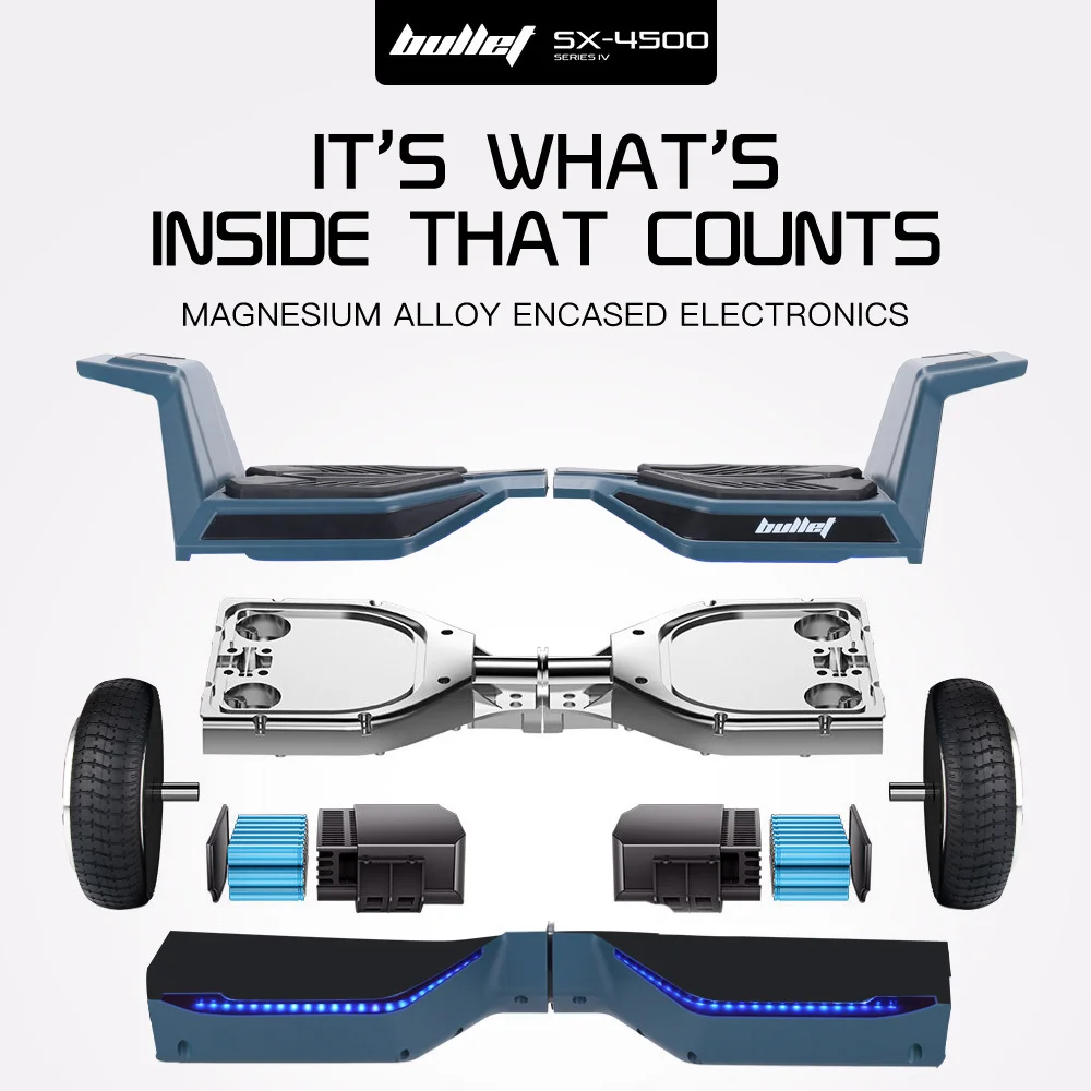 Experience a next level hoverboard with the state-of-the-art Bullet SX-4500. Its high-speed chipset reacts instantly to your bodys movements, offering highly responsive acceleration, turning, and reversing.