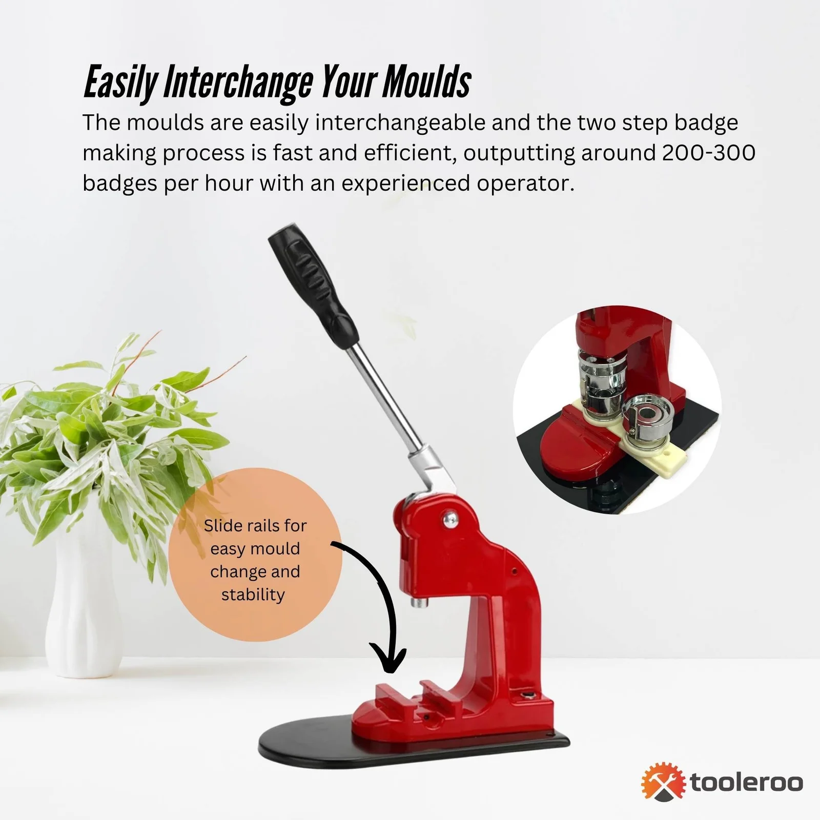The moulds are easily interchangeable if you have others and the two step badge making process is fast and efficient, outputting around 200-300 badges per hour with an experienced operator.