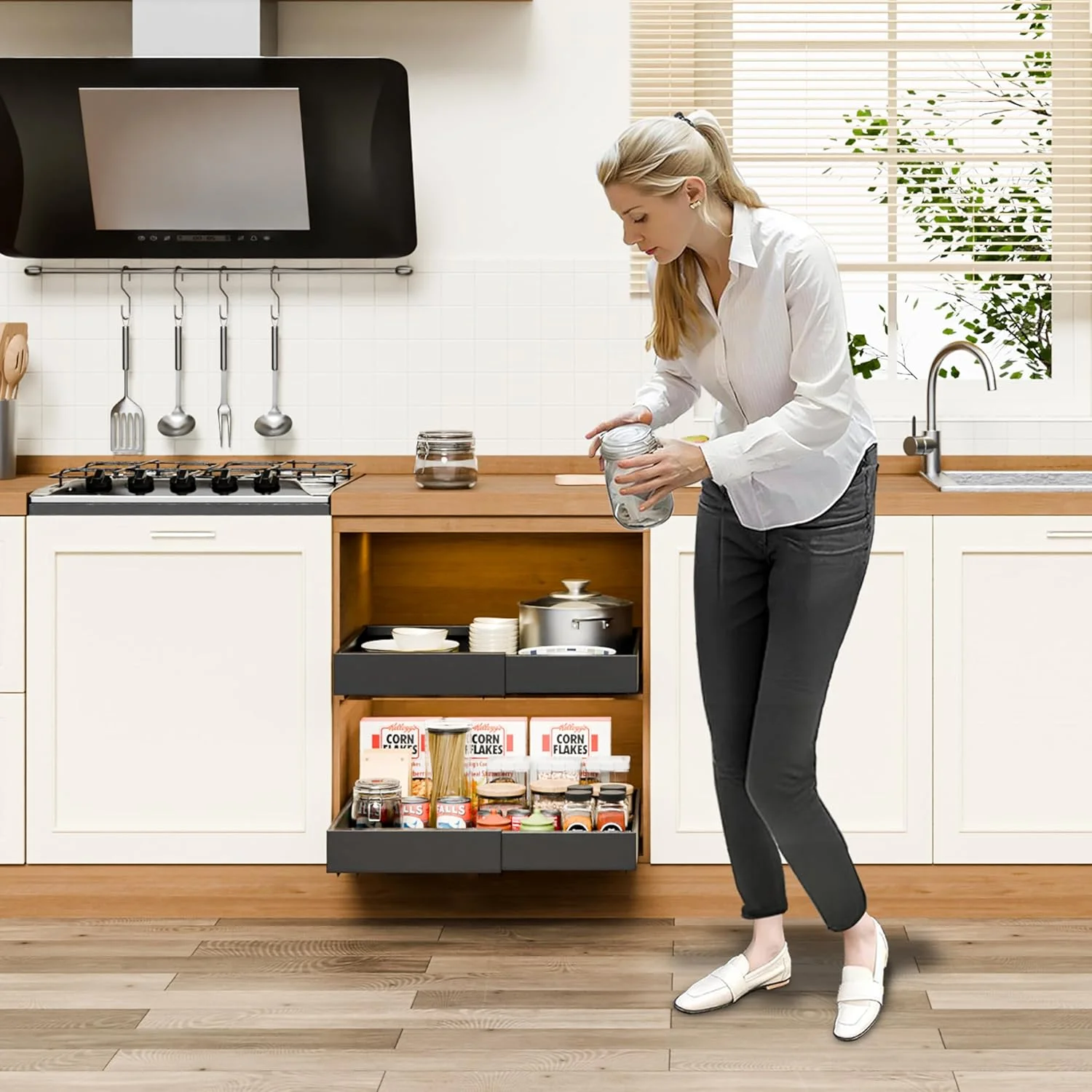 • EXPANDABLE DESIGN FOR PERFECT FIT: Easily adjust the width of each pull-out drawer to fit cabinets from 32 cm to 52 cm. This flexible design maximizes cabinet space in kitchens, pantries, bathrooms, and more—no more wasted corners or unreachable items.
