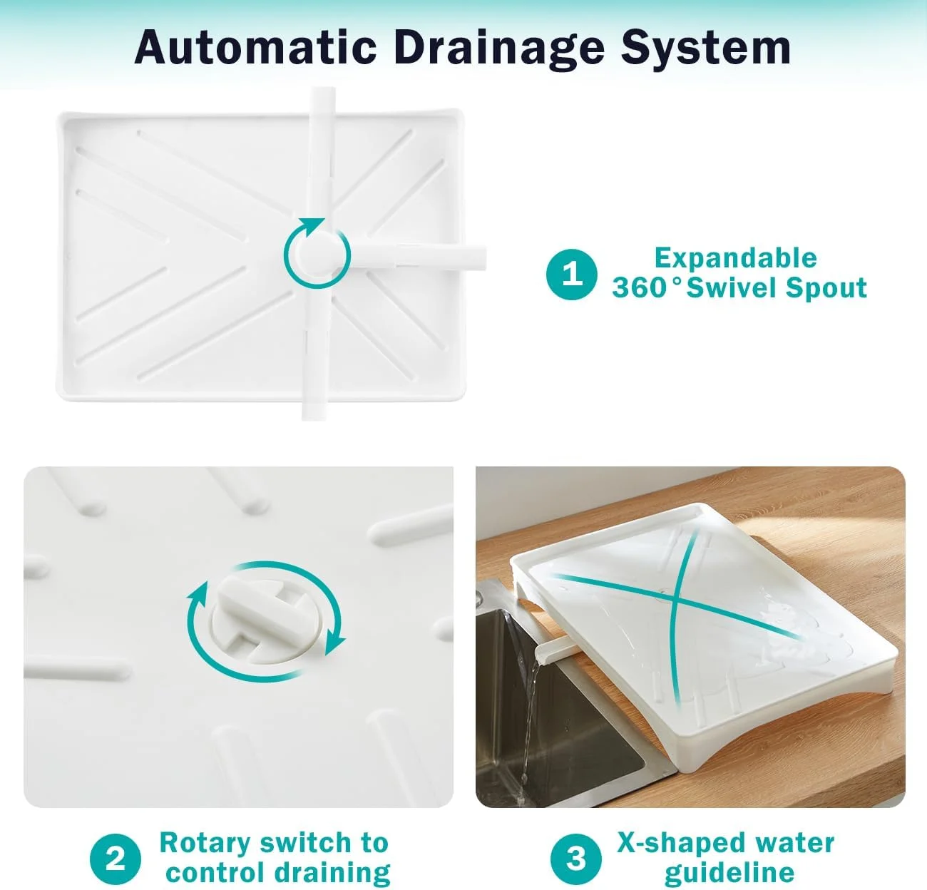 • BUILT-IN DRAINBOARD WITH SWIVEL SPOUT: Includes an auto-drain tray and 360° rotating spout to channel excess water directly into the sink, keeping your kitchen counter clean and dry at all times.