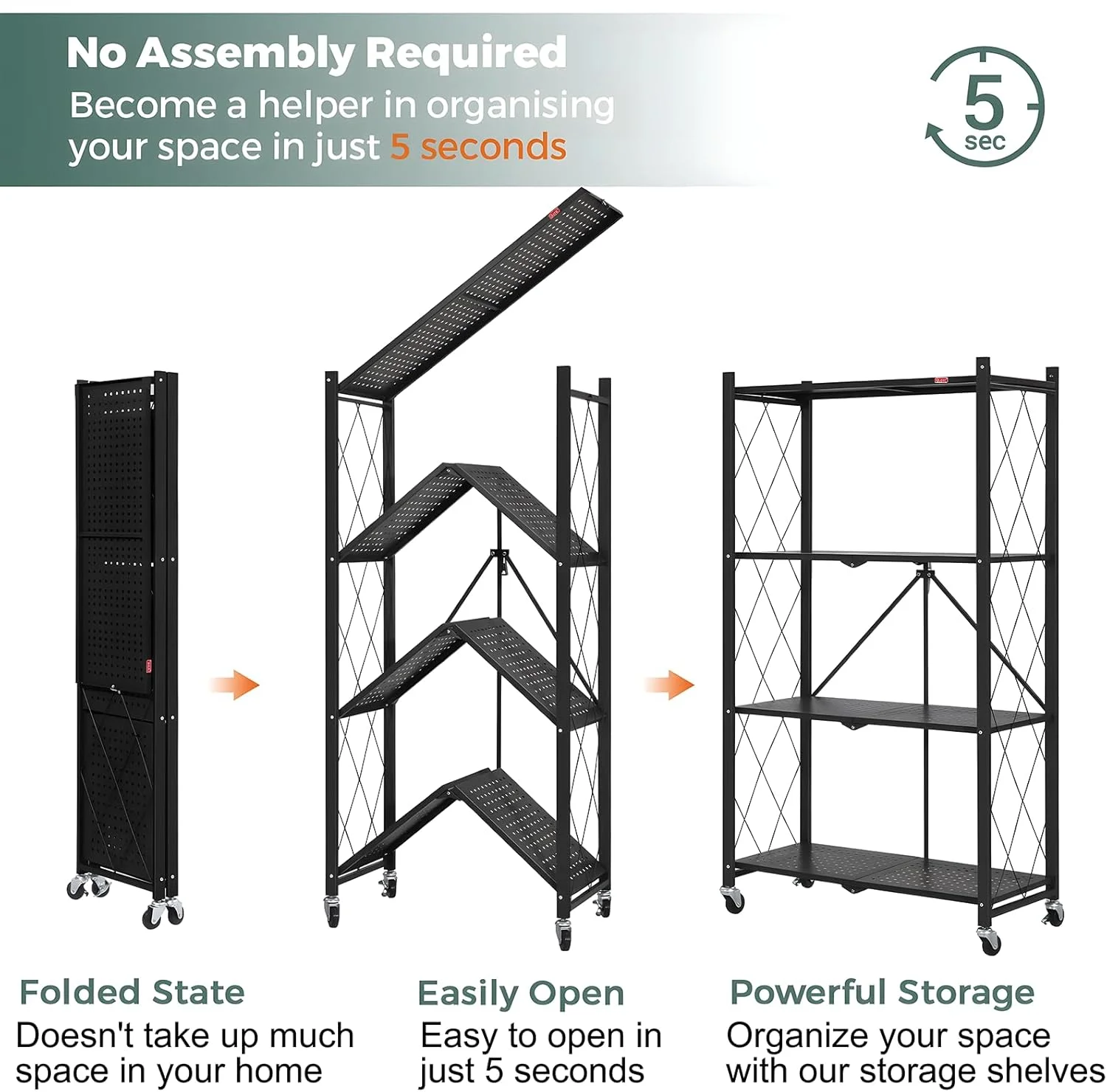 CARLA HOME 5-Tier Foldable Storage Shelf with Wheels for Kitchen, Garage, Pantry or Basement (Black)
