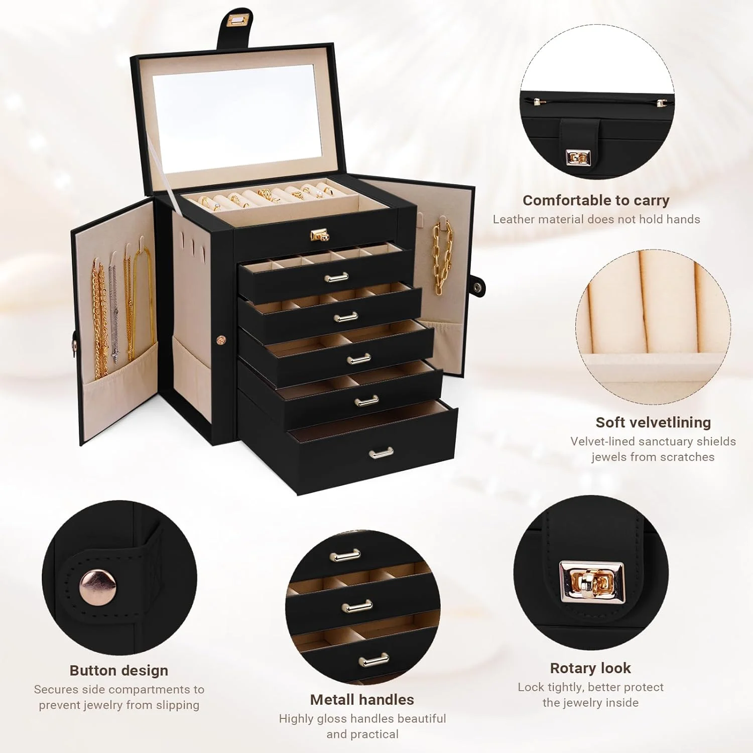 CARLA HOME 6-Layer Large Jewelry Box for Women withDrawers, Mirror, Lock, Necklace Hooks & Side Compartments for Rings, Earrings, Bracelets, Gifts (Black)