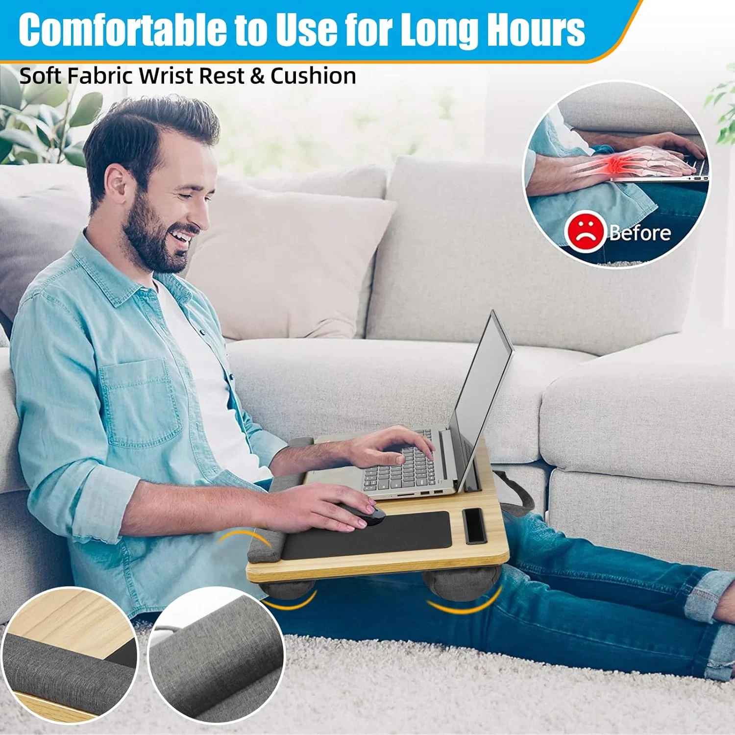 - COMFORT-FIRST DESIGN: Designed with a dual-cushion base and plush wrist pad, this lap desk offers maximum comfort during long work sessions. It evenly distributes weight and keeps your lap cool, making it perfect for bed, couch, or travel use.