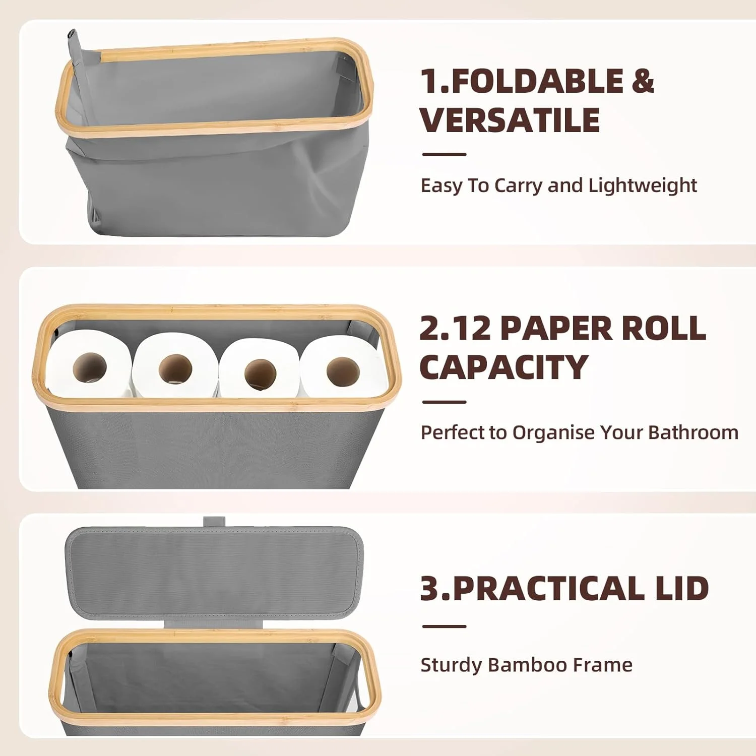 CARLA HOME Toilet Paper Storage Basket Holds Up to 12 Rolls with Bamboo Lid and Handle for RV Closet (Grey)