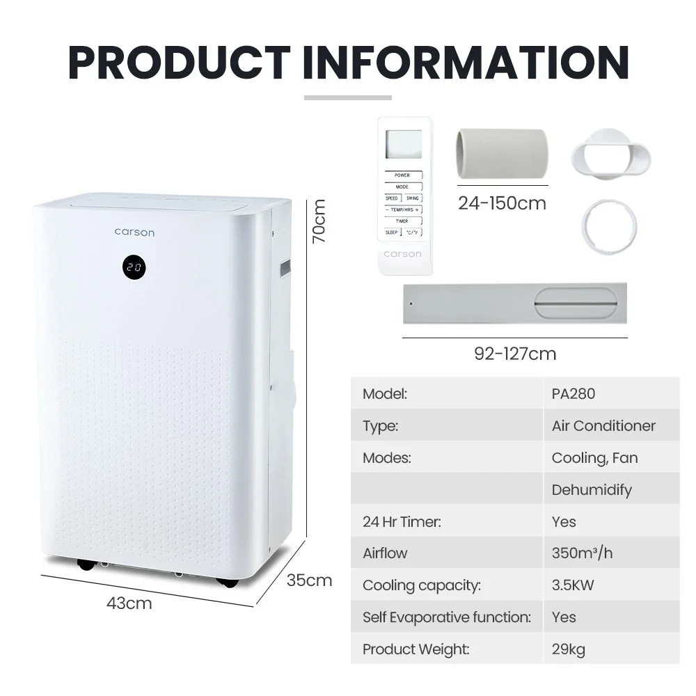 Keep your home comfortable with the Carson PA280 Portable Air Conditioner. Just sit back, relax, and use the remote control to adjust the temperature from the comfort of your lounge. This compact unit is ideal for cooling rooms of up to 25 square metres.