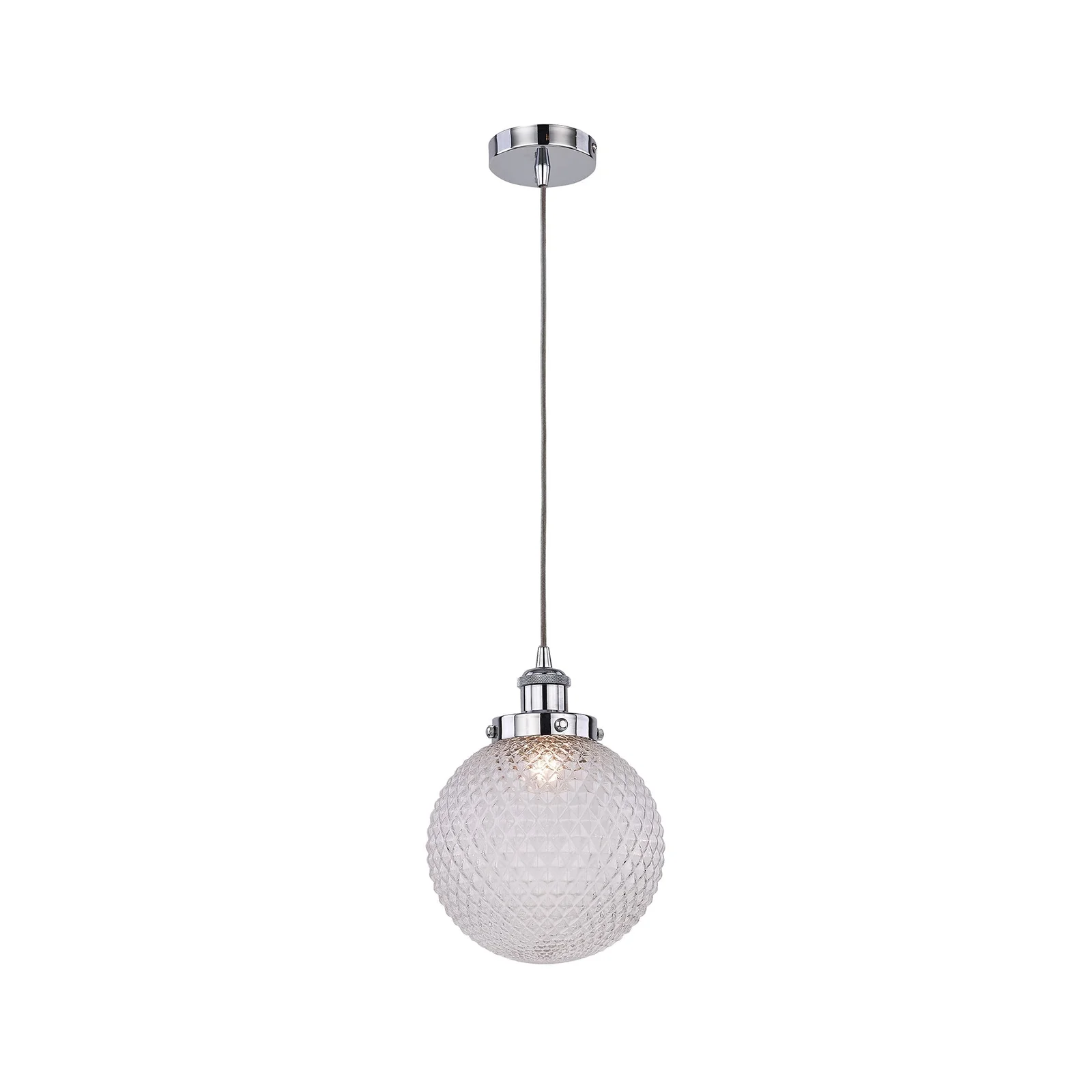 The Casablance Pendant Light offers a classic spherical design that scatters light via a dimpled diamond glass cover. The ceiling mount and main fixture feature a striking chrome finish from which the sphere hangs.