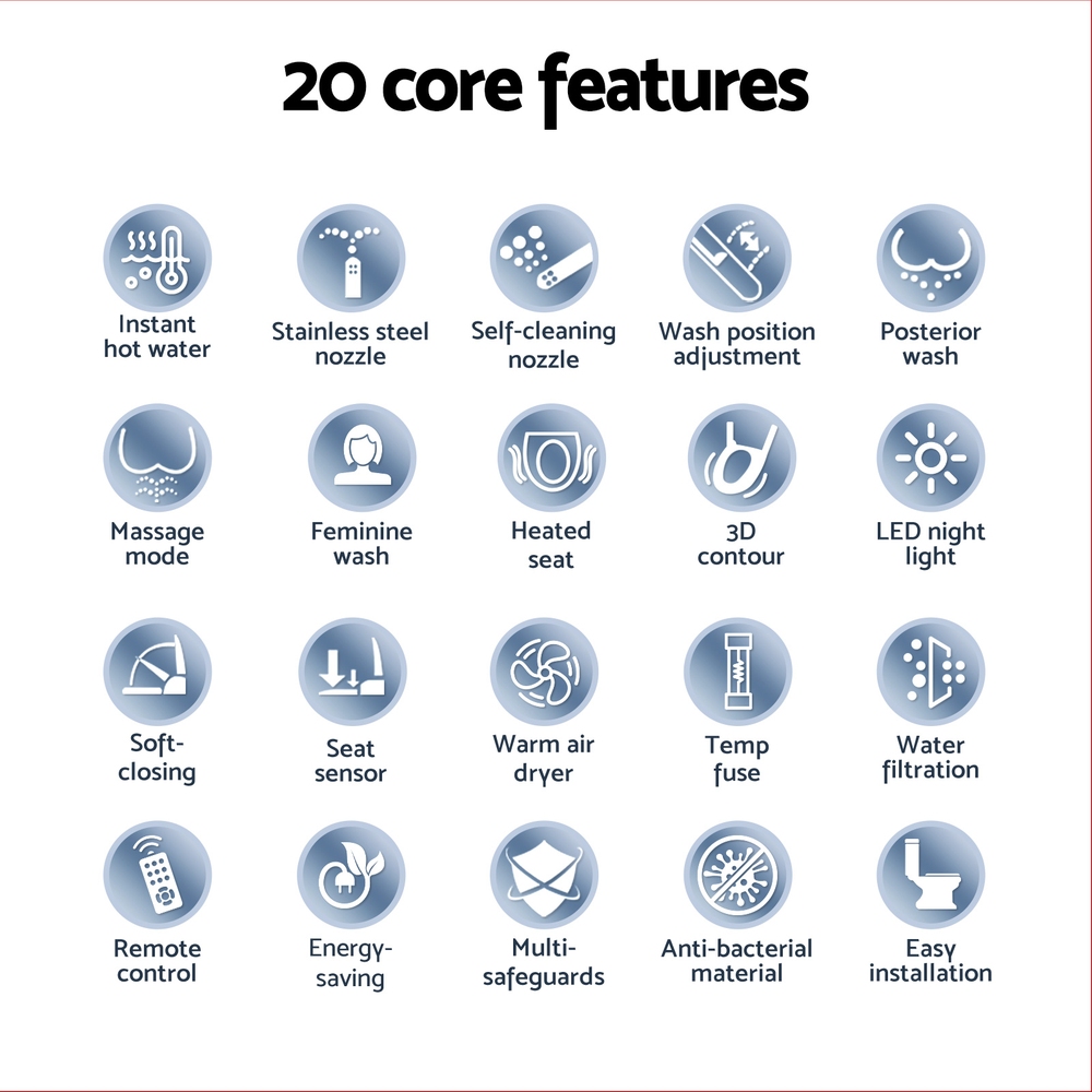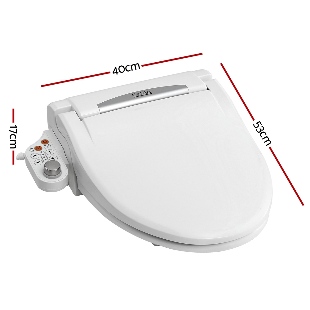 Transform your bathroom into a sanctuary of cleanliness comfort with the Cefito Smart Bidet Toilet Seat. This electronic bidet boasts IPX4 waterproofing and a user-friendly one-knob with adjustable water temperature (up to 40��) and spray intensity. Key features include a self-cleaning stainless steel nozzle, LED night light, and automatic deodorisation. Experience luxury with a heated seat (up to 40��) and warm air dryer. Designed for energy-saving, this Bidet Toilet Seat includes water-filtering and multi-safeguards for peace of mind. Its slow-closing lid adds quiet convenience to your toilet bidet experience.FeaturesSmart bidet toilet seatIPX4 waterproofWireless remoteOne-knob designLED night LightSelf-cleaning nozzleBuilt-in automatic body sensorStainless steel nozzlePosterior washFeminine washOscillating washMassage modeAdjustable wash positionAdjustable water spray intensityAutomatic deodorisationAdjustable water temperatureAdjustable air dryer temperatureAdjustable seat temperatureEnergy-savingWater-filteringSlow-closing lidMulti-safeguardsSpecifications:Material:ABSCord length :1.6M Voltage: AC220-240V 50HZWater pressure: 0.1 to 0.7 MpaWater flow rate: wash: 0.45L/min~0.65L/minWater pressure control: anus wash and 4-step feminine wash controlled by micro computerWater temperature control: 4-step adjustment (OFF, 34��, 37��, 40��)Warm water storage tank: 325mLWater safety device: Water Level Switch, temperature sensor, temperature fuse, temperature control switchWarm washing power: 1500WWarm seat power: 45WDryer temperature control: 4-step adjustment (OFF, Low, Middle, High)Dryer safety device: temperature fuseSeat temperature control: 4-step adjustment (OFF, 34��, 37��, 40��)Seat safety device: temperature sensor, temperature fusePackage ContentElectric Bidet Seat x 1WaterInletTube (length:6cm,diameter:6.5mm) x 1Bidet Accessories (Package) x 1User Manual x 1This product comes with 1 year warranty