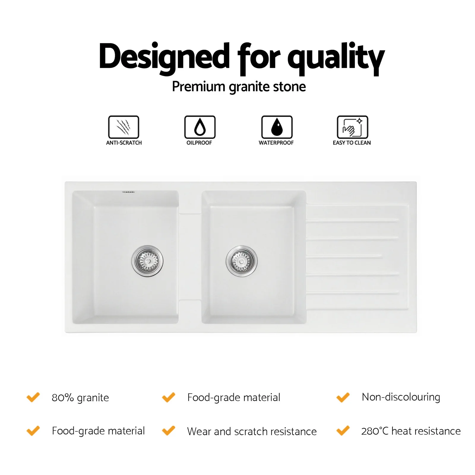 Elevate your kitchen utility with our Stone Sink series, designed for superior performance and lasting aesthetic appeal. This product is constructed using an advanced composite material, featuring a high concentration of 80% granite for a dense, highly durable body. The surface is engineered to handle rigorous daily use, demonstrating reliable impact and wear resistance against heavy things. Functionality is paramount: the sink is resistant to scratching, high heat (up to 280°C/536°F), and oil penetration, simplifying cleanup and maintaining a flawless appearance. Built with food contact grade materials, the non-porous structure is designed to support a hygienic preparation area. This versatile range offers both Single and Double Bowl options, available in contemporary Black or White finishes, ensuring an appropriate size and style is available for any home renovation or new build project.