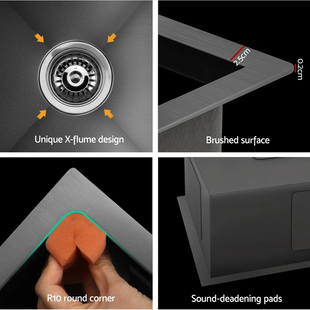 The Cefito Handmade Stainless Steel Sink is built to exacting standards so that you get the very best of quality materials and craftsmanship. It is crafted from heavy-duty food grade 304 stainless steel, unlike others that are made from inferior 201 grade or 304 imitations. Built to be scratch-proof, oil-proof and more importantly, bacteria-free, the silky-smooth satin-coated stainless-steel sink also features an X-flume design for easy drainage, deep and wide bowl for practicality, R10 rounded corners for safety and easy cleaning,anti-condensation paint, and sound-deadening pads. Suitable for drop-in, flush-mount or under-mount installation, our stainless steel sink should have a definitive place in your uncompromising kitchen.