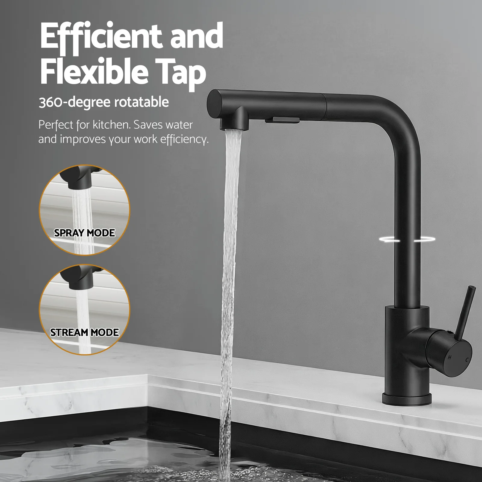 The pull-out mixer tap features a 35mm drip-free ceramic cartridge, 360° swivel, and button spray. Fits 35-38mm tap holes.