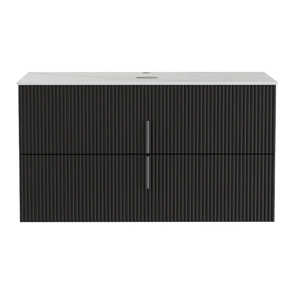 Transform your bathroom with the Cefito 900mm Black Vanity Unit, blending bold modern design and practical functionality. Perfectly sized for Australian homes, this wall-hung cabinet features a matte black soft-flute timber front, contrasted elegantly with a Carrara white engineered stone countertop for timeless appeal.