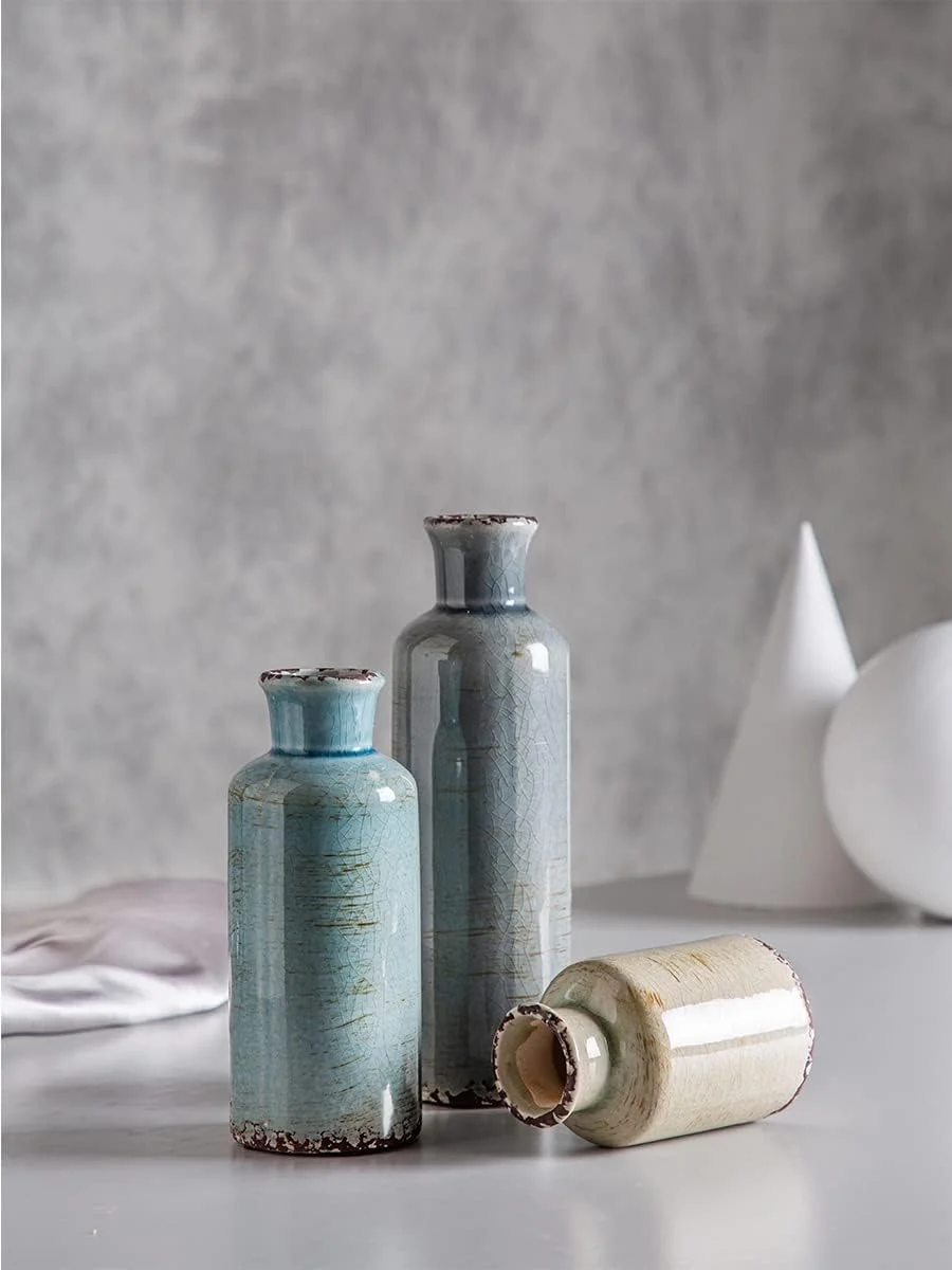 Crackled Finish Ceramic Vase Set Blue Farmhouse Decor