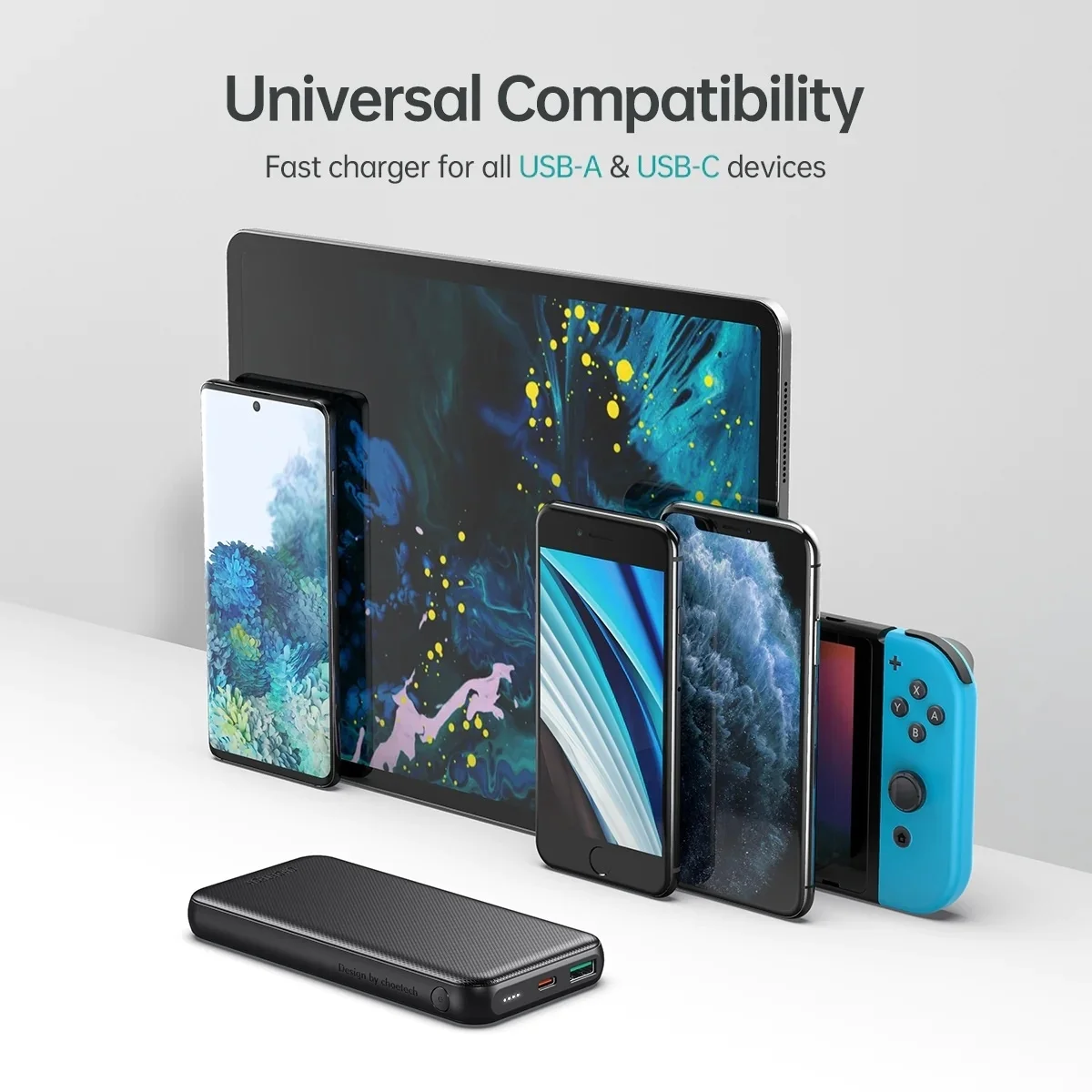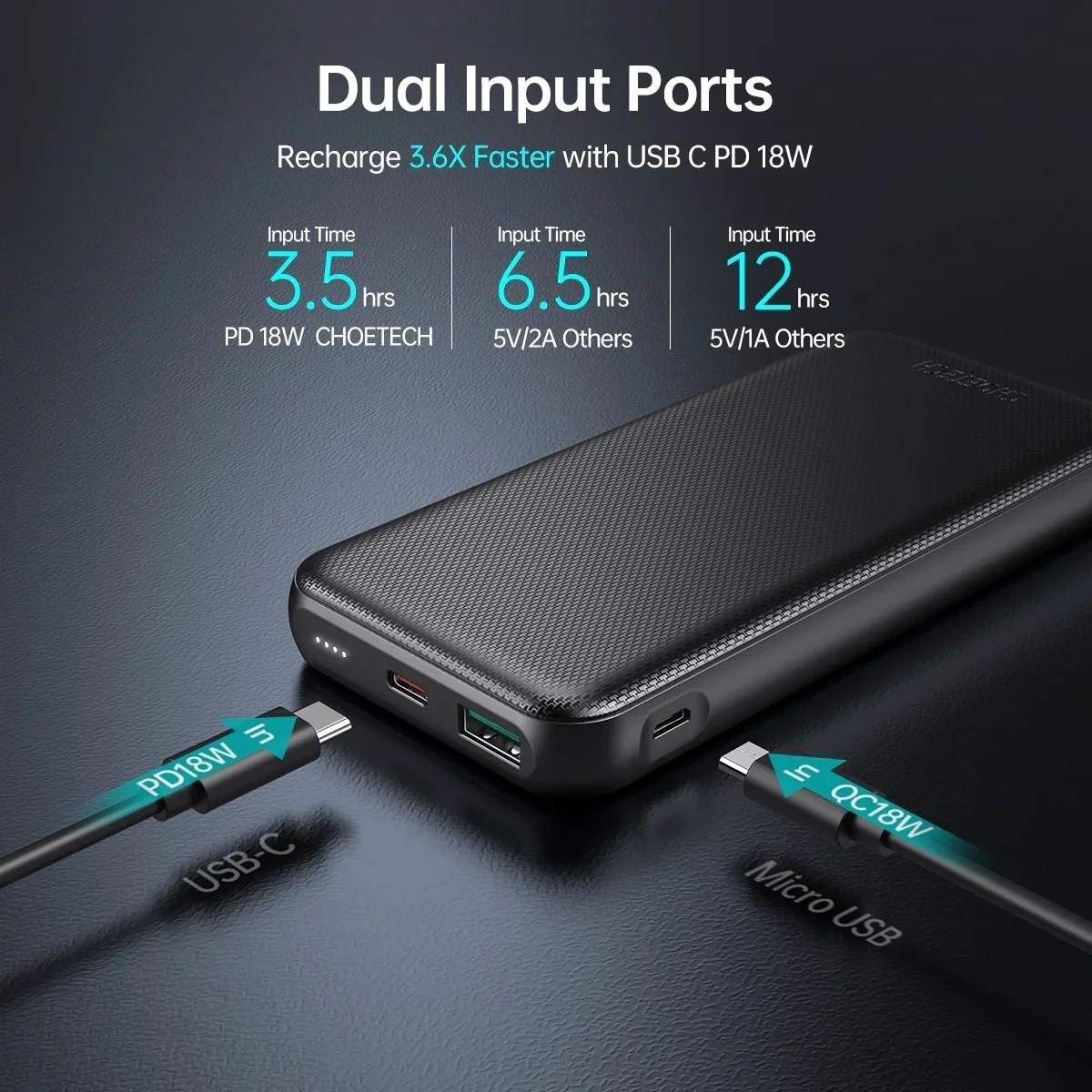 Both USB-C and USB-A ports are equipped with Qualcomm QC 3.0/2.0 technology that can fully charge your Android phone in about 1.5 hours. It can also charge your headphones or eReaders.