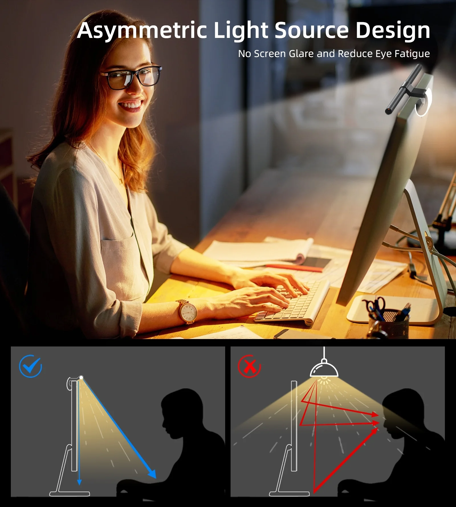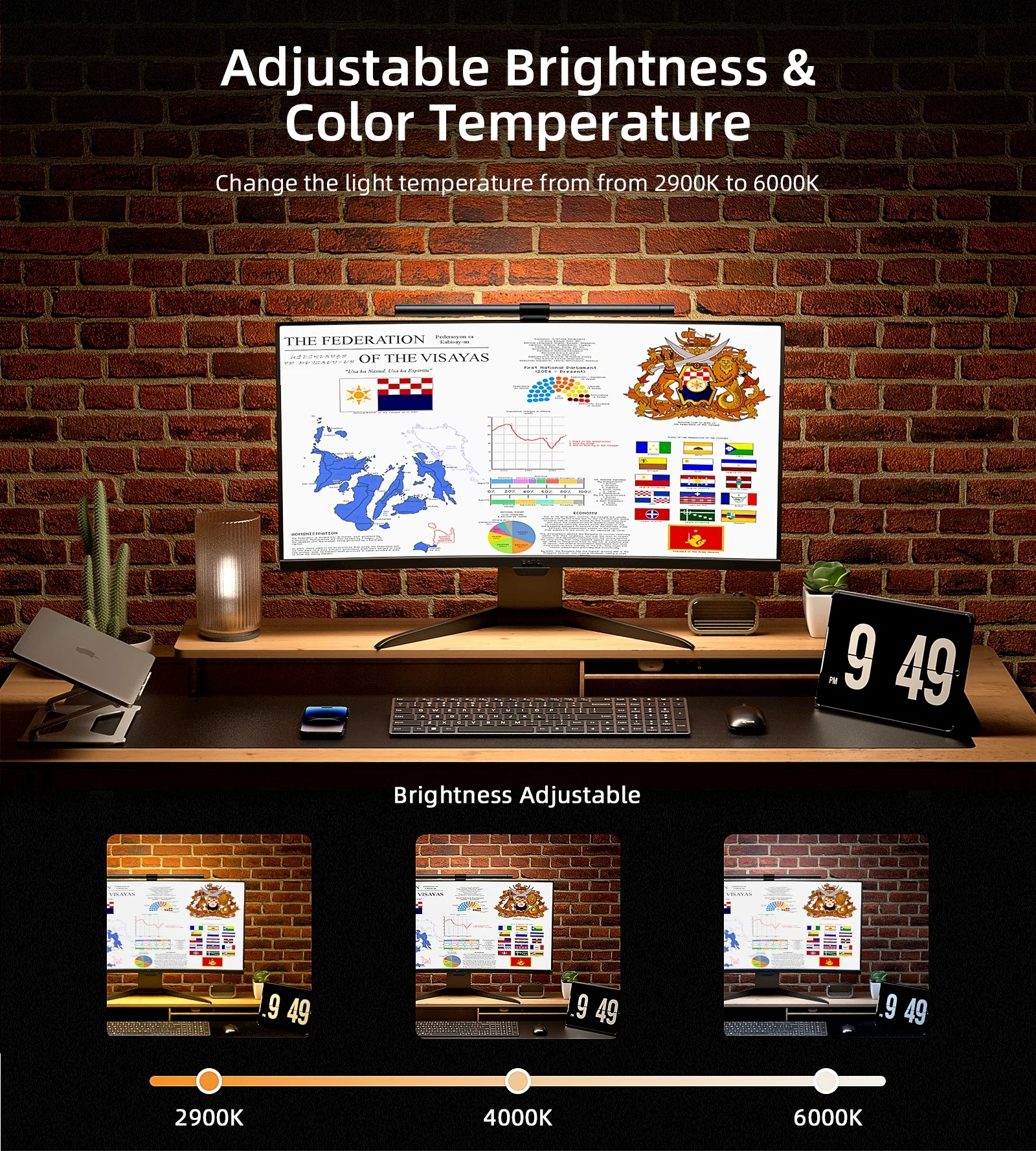 Thanks to the mounting on the monitor, the lamp perfectly illuminates only the working space on the desk. Due to the use of two sets of LEDs with different color temperatures, the emitted light has three colors.