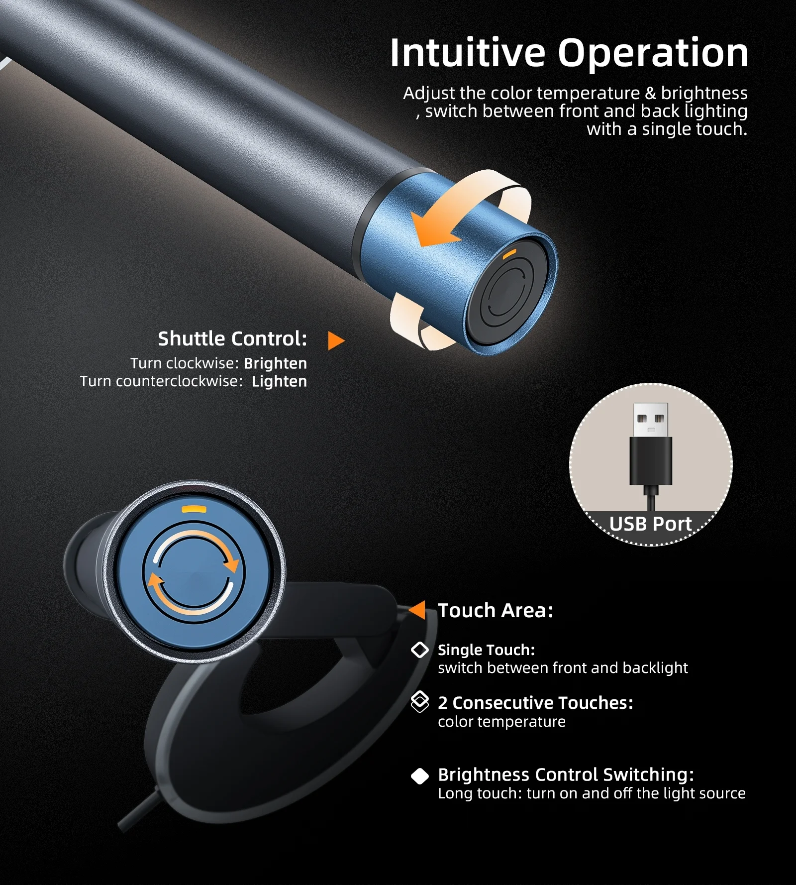 Light source type: Cold and warm dual-color LED Color redering index: RA>95 Adjustable color temperature: 2700K-6500K Illumination: >500Lux Light source: Front and Rear Lights Power input: 5V/1.4A Power Consumption: 7W Max Material: Aluminium alloy, Zinc alloy, ABS Light Bar Size: 50cm