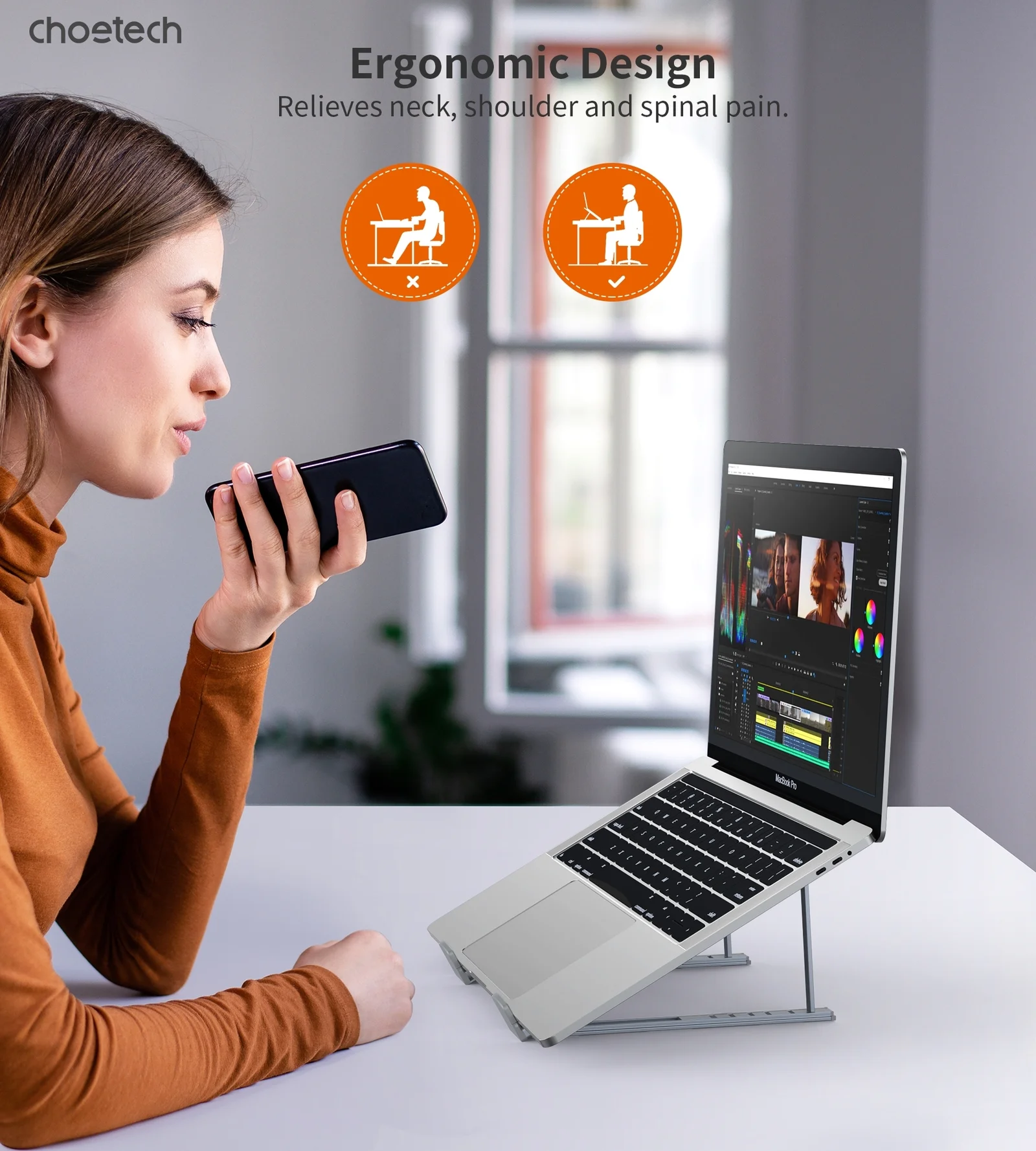 This product features a robust and unique aluminum design that ensures exceptional structural integrity. It provides an ergonomic user experience, allowing for comfortable and convenient usage. You can easily adjust the stand's height to achieve your preferred viewing angle, both up and down. Its specially engineered design ensures optimal airflow for your laptop while it's on the stand. The anti-slip silicone pads prevent any movement or sliding of the stand or your computer during use. Compatible with laptops, notebooks, and Macbooks ranging from 11 to 17 inches in size. Its foldable structure makes it incredibly portable for easy transportation.
