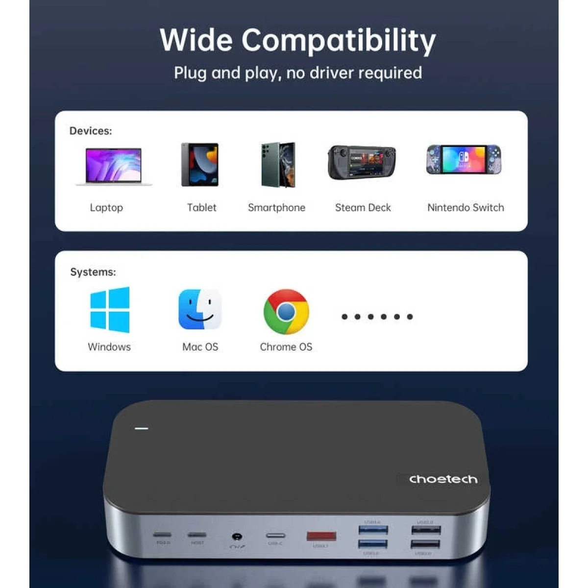 Equipped with one PD3.0, one USB-C (host), one 3.5mm Audio & mic, one USB-C data, one USB-A 3.1, tow USB-A3.0, two USB-A2.0 one VGA, two HDMI, one DP, one RJ45 and one SD&TF card, this USB-C Hub turns PC laptop into a mobile workstation.