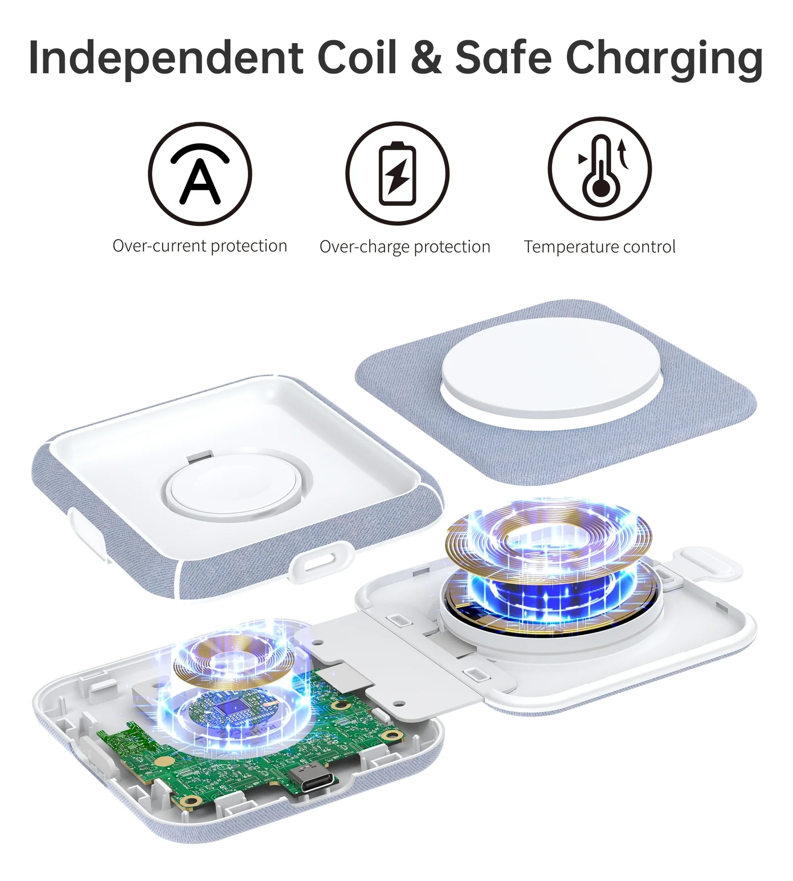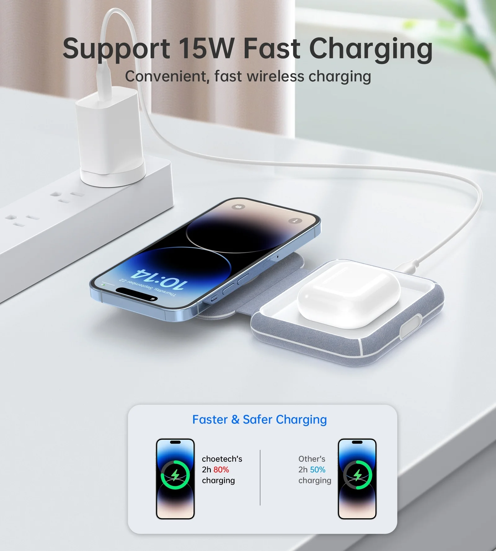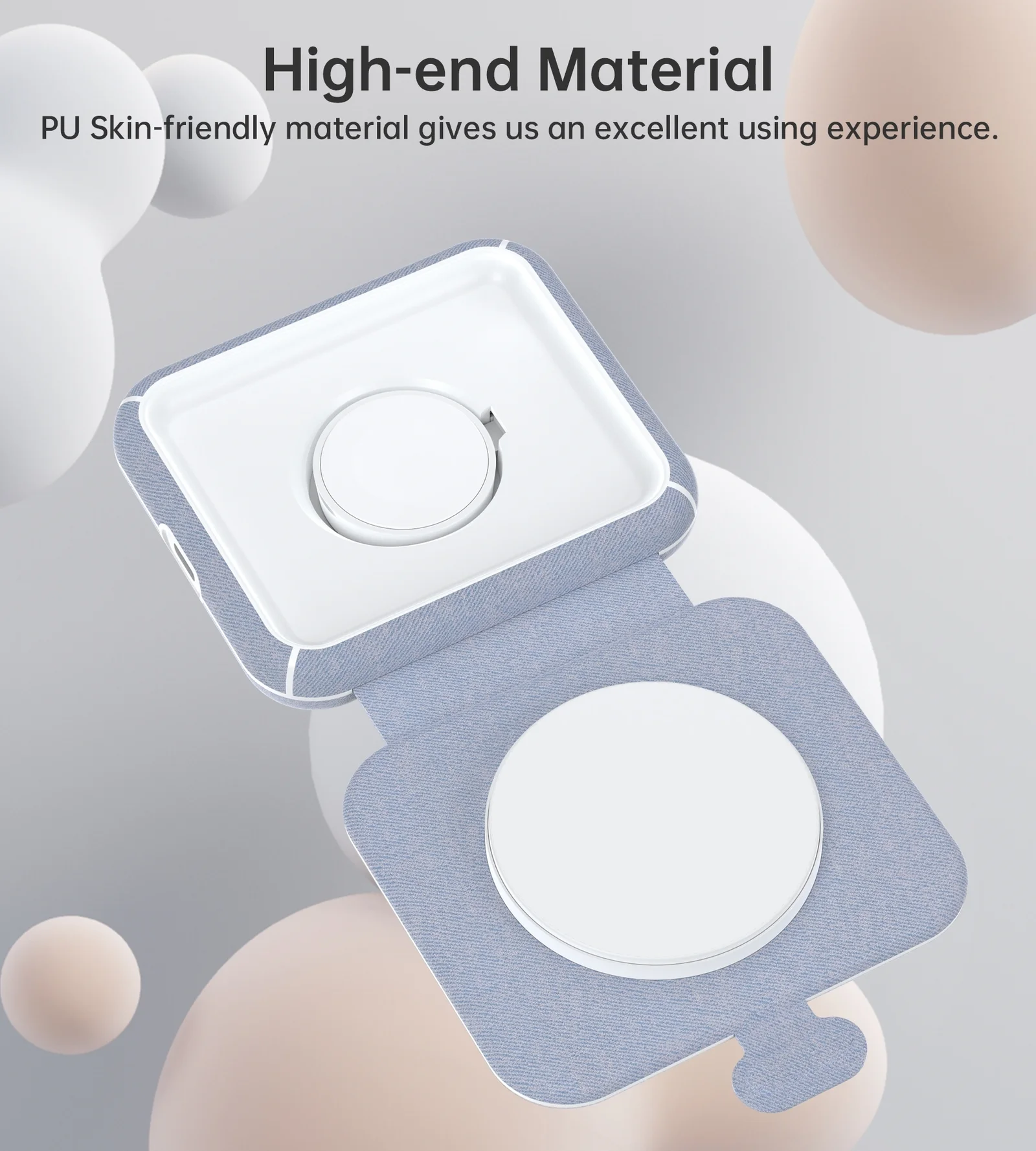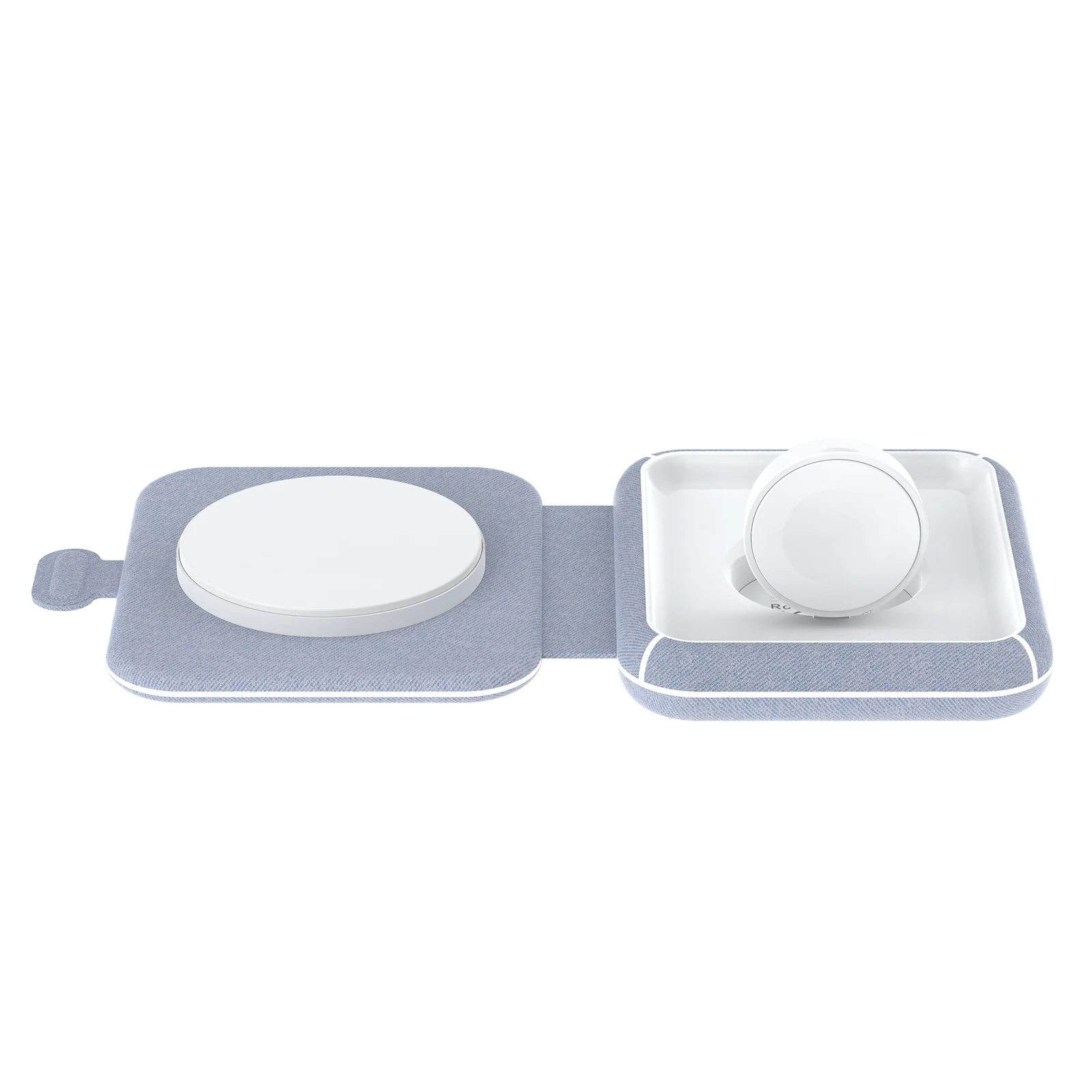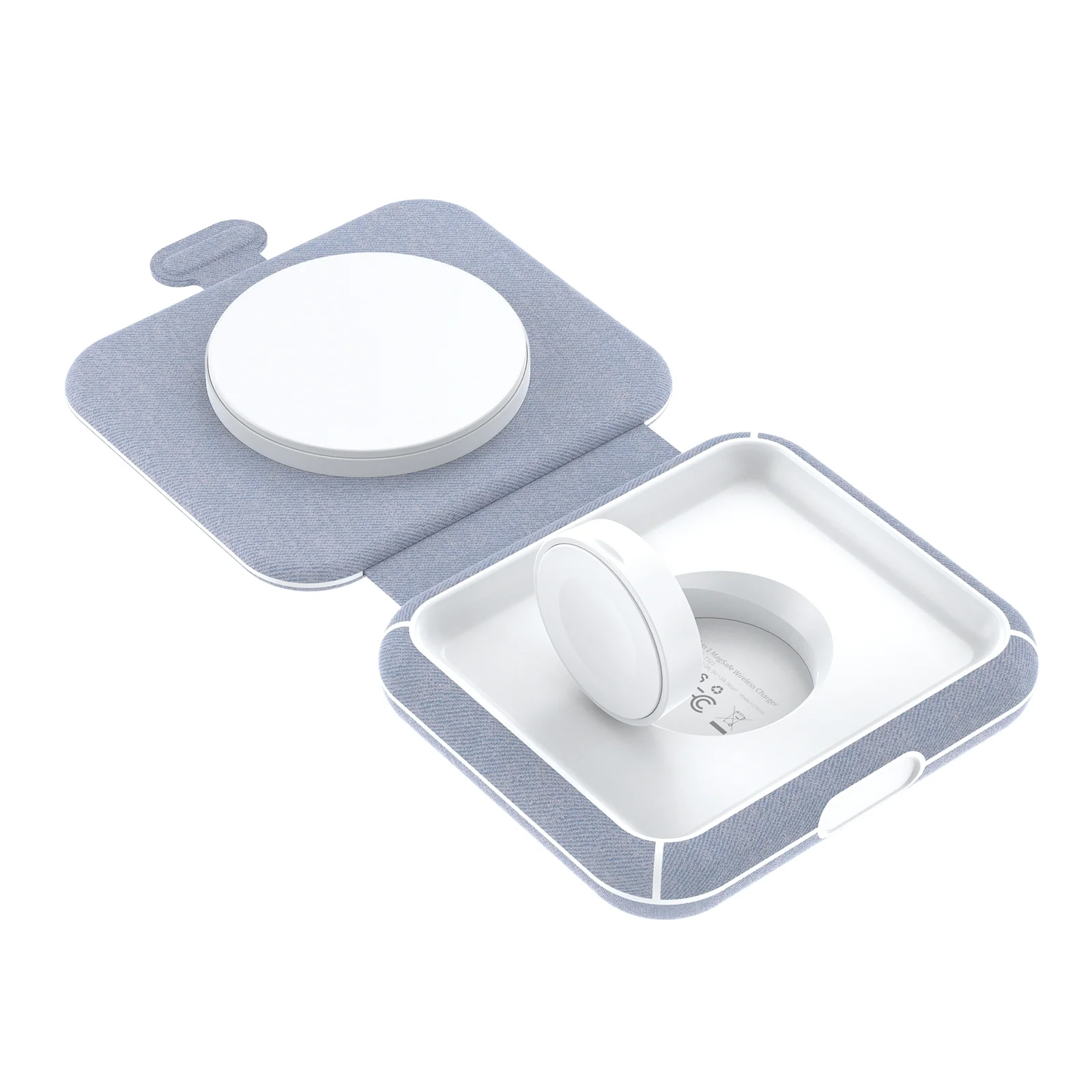 Model: T323 Material: ABS+PU Interface: USB-C Input: 5V-3A, 9V-3A Outpu:t Apple Watch 3W (max) + iPhone 15W (max) Foldable Size: 94 × 88 × 23mm Available: Color light blue+white Certifications MFI&MFM CE, RoHS, FCC