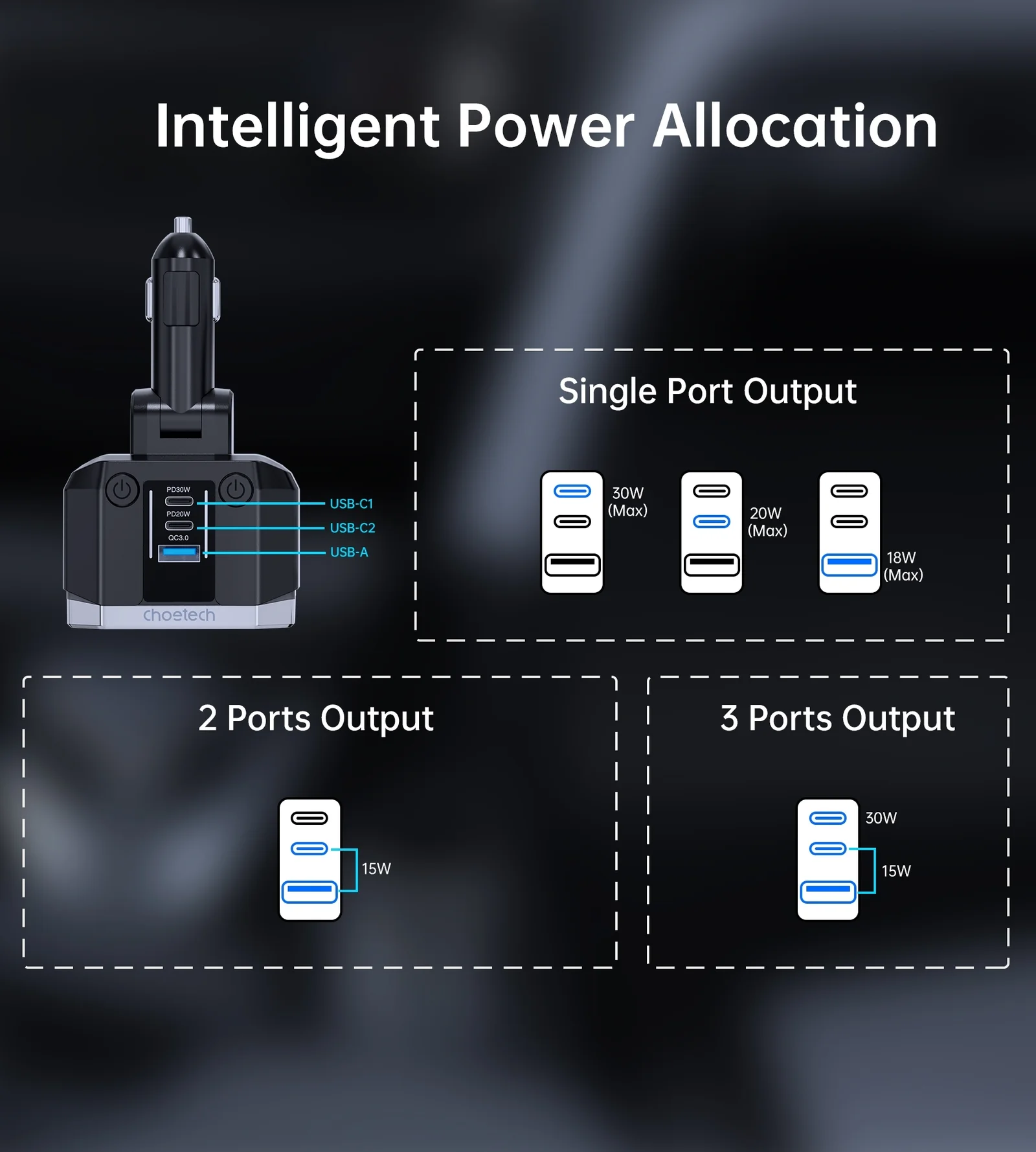 Smart Power Allocation Adjusts power output for optimal charging speed, offering 30W to Type-C PD, 20W to the second Type-C, and 18W to Micro-USB A.