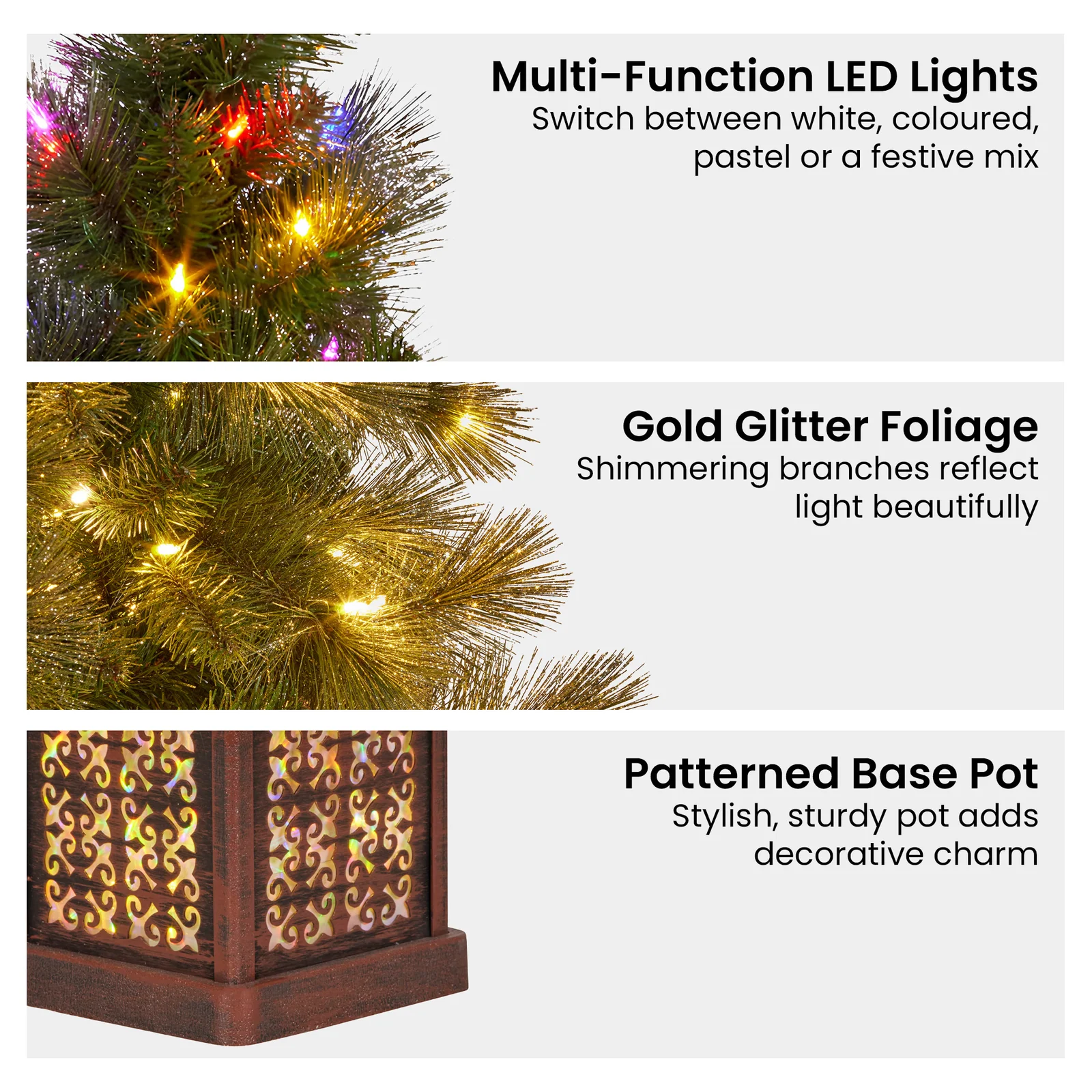 Bring festive sparkle to any corner with the 4ft Glittery Gold Pine Christmas tree. Its shimmering gold glitter foliage is paired with a patterned base pot for a sophisticated style. Built-in multi-functional LED lights offer ten settings, from warm white, vibrant colours and pastels, all controlled by a handy foot pedal. Perfect for entrances, tables or small spaces, it’s a dazzling Christmas addition.