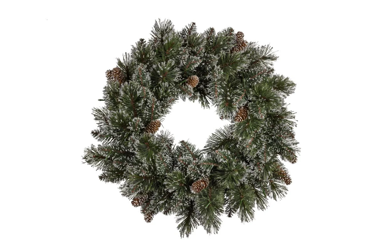 With a touch of elegance added by a glitter finish, pine cones, and LED lights, this wreath is sure to make a grand statement during the festive season.