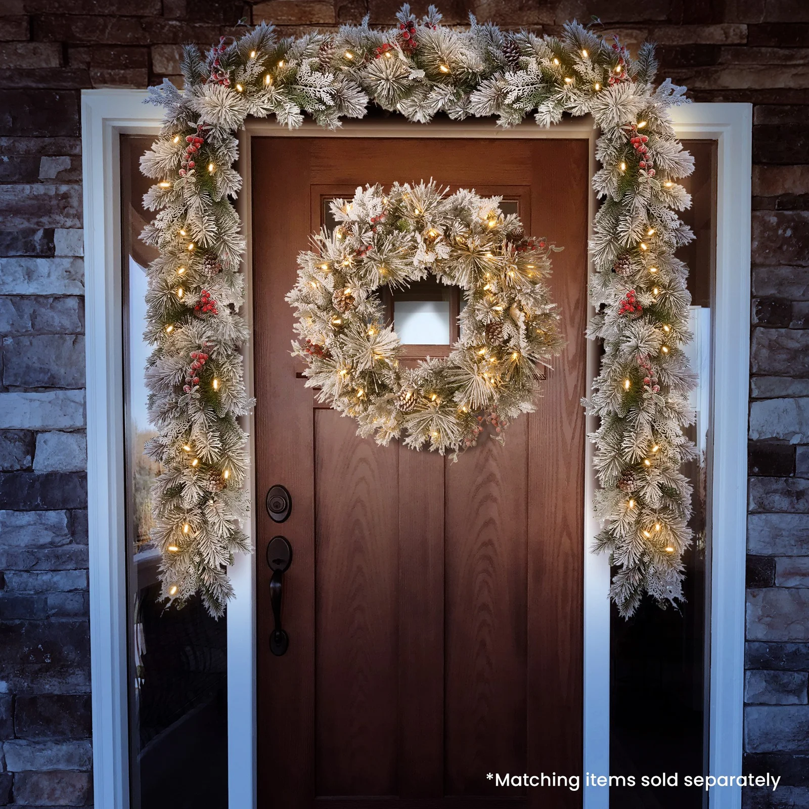 This front door decoration blends lifelike evergreen foliage with a frosted, snow-kissed finish to create a true winter wonderland at your entry.