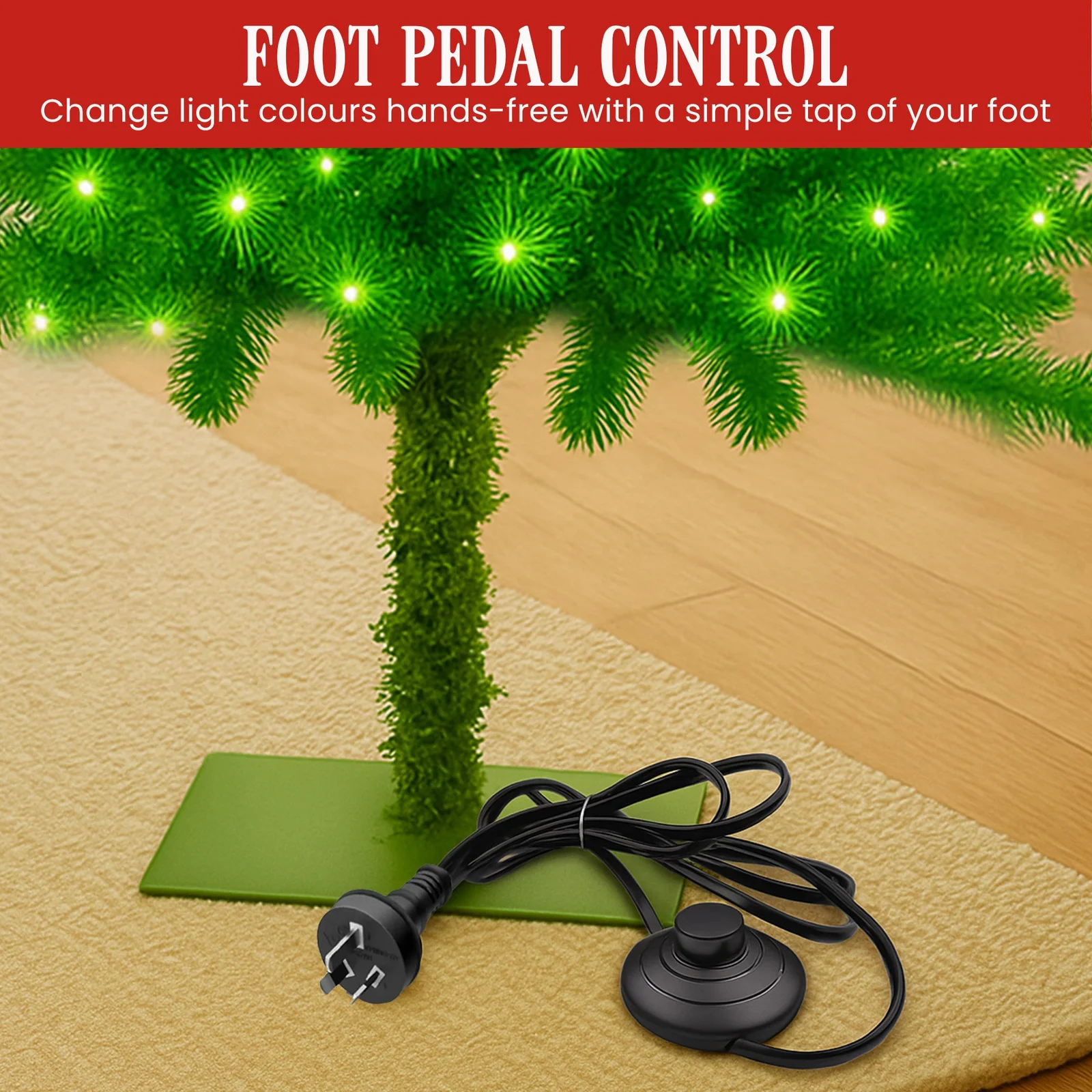 Who let the Gremlin tree in? This quirky Christmas tree brings playful mischief to your festive setup. Standing at 7.5 feet tall (229cm), it features a curved top with a bold red bauble, built-in green and white lights controlled by a foot pedal and a matching green base and cord.