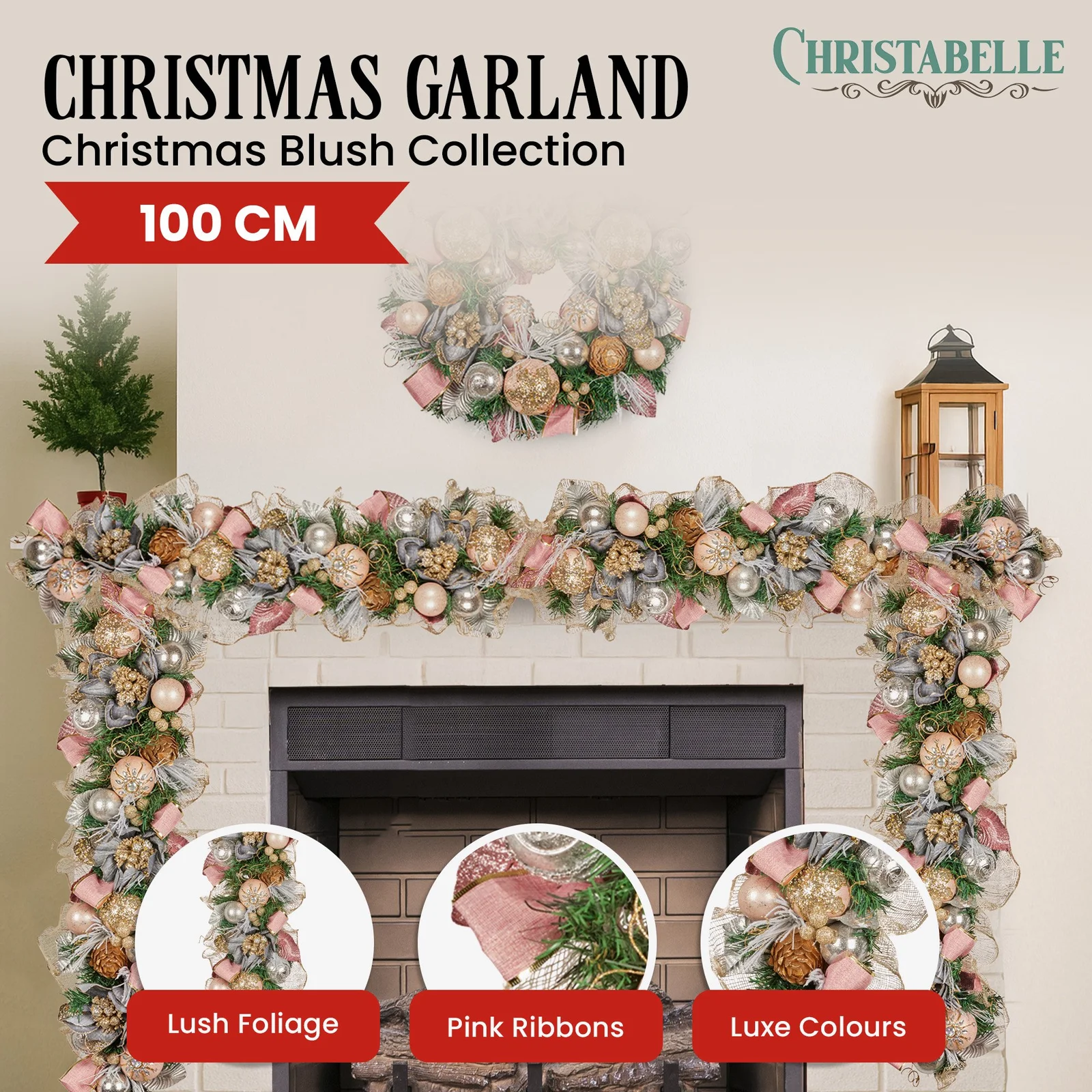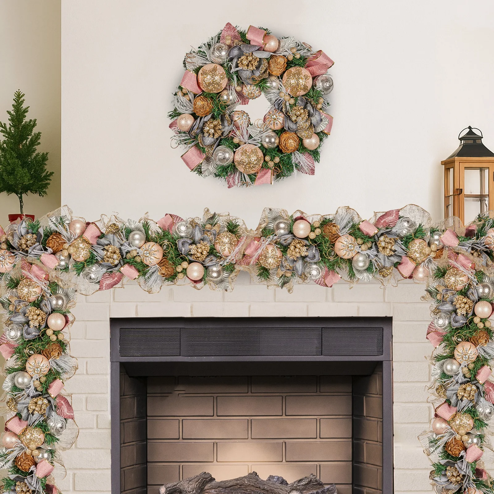 Dress up your holiday spaces with a garland that sparkles in pink, champagne and silver. Pre-decorated with florals, baubles, pine cones and berries, its lush green foliage brings festive warmth to shelves, banisters or tree, no fluffing or fussing required, just instant Christmas charm wherever you drape it.
