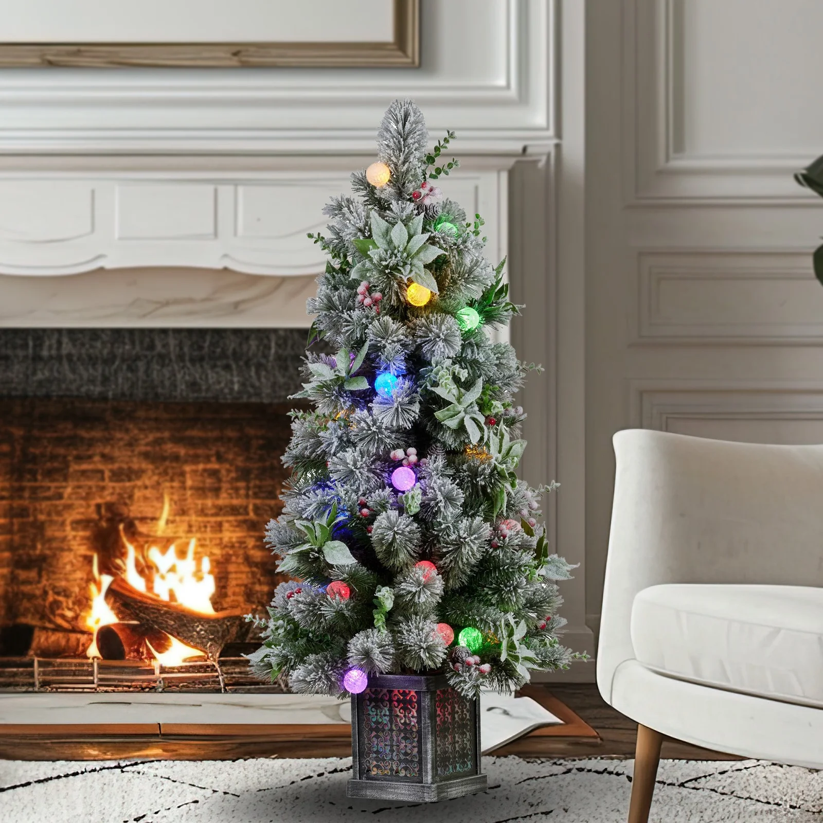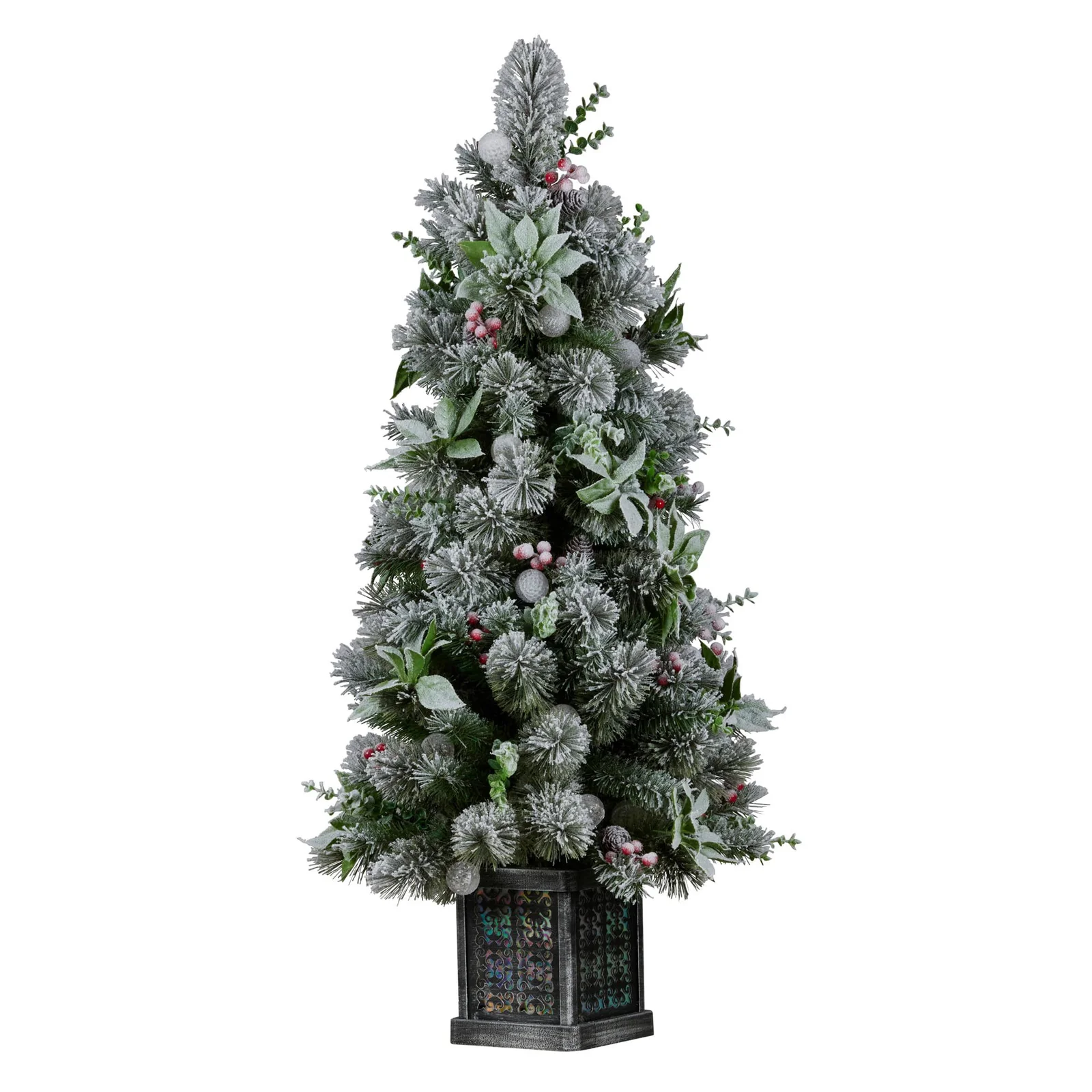 Get your holiday vibes on point with the gorgeous Snowy Crown Pine Christmas Tree. Its lightly frosted foliage gives off those wintry feels and the berries, pine cones and poinsettia flowers add that extra festive touch. Brighten up your room with its 30 LED snowball lights that offer 11 different light settings, including various colours and warm white hues. Plus, the foot pedal control makes it a breeze to switch things up and keep your tree looking fabulous. Great for filling small spots or placed by the entryway, make your holiday setup complete with this stunning 4ft tree!