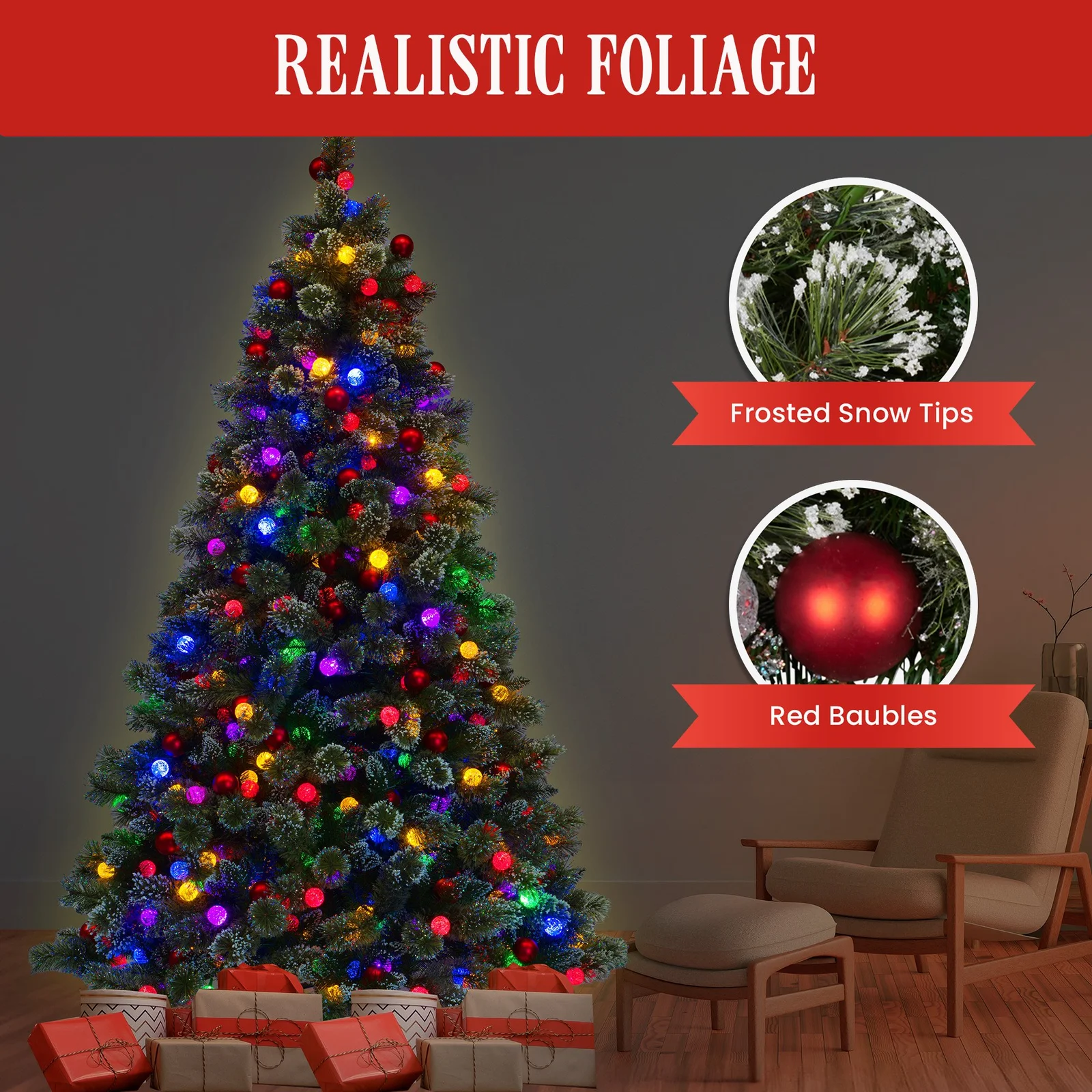 Make your holiday setting beaming with magical glow with the Snowy Bristle Christmas Tree! This 7.5ft (229cm) tree is decked out with frosted snow bristle tips and adorned with bright red baubles, radiating vibrant festive vibes. It comes alive with 350 LED snowball lights that offer 11 different light settings, from colours to warm white and everything in between. With easy foot pedal control, you can easily bring this tree to life, making it the ultimate centrepiece for a cosy and enchanting holiday season.