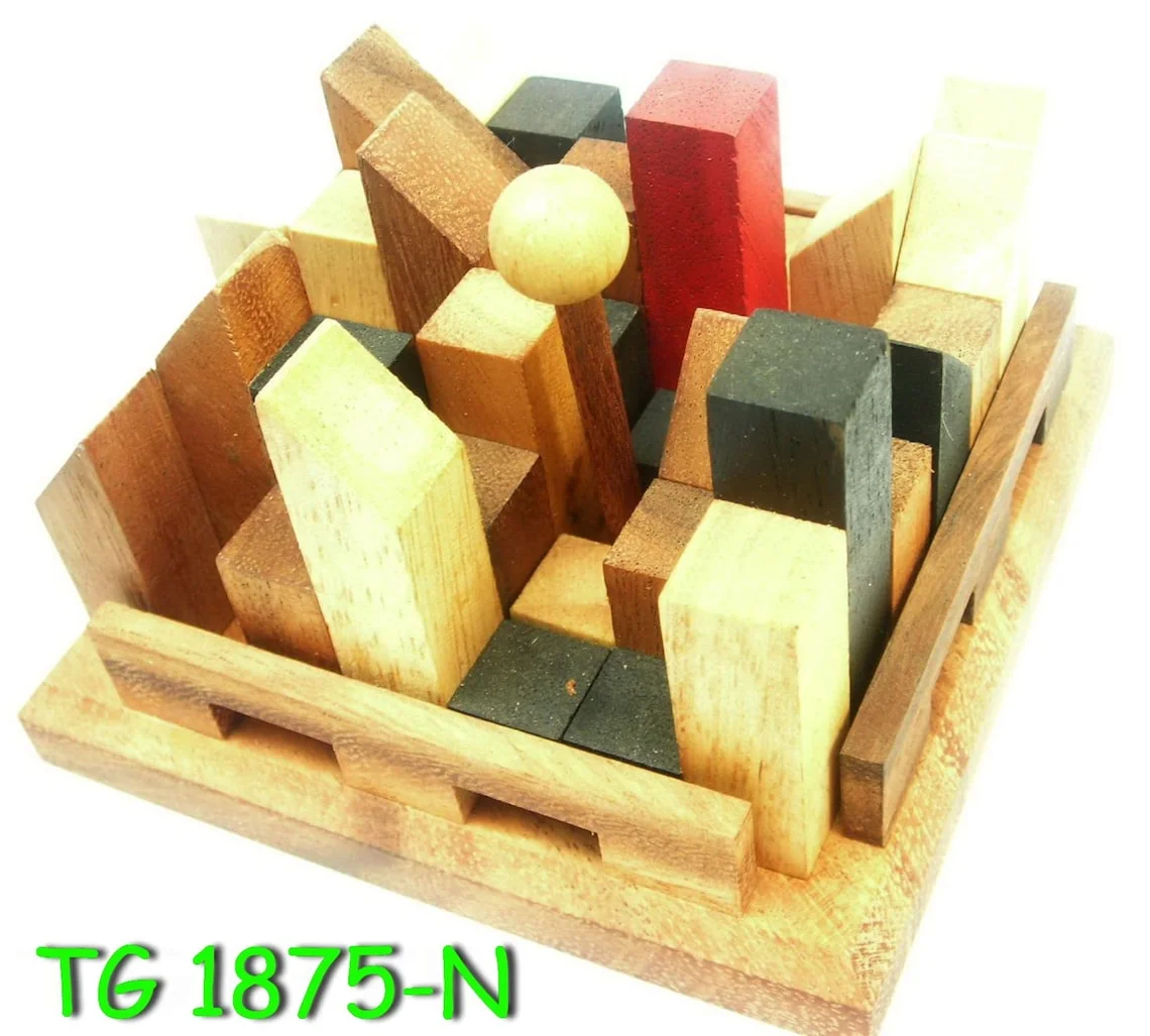 The object : 13 different puzzles in one. Place the dowel pin into any of the holes in the base and then build the city around it. Each hole demands a different and unique placement of the pieces to solve the puzzle.
