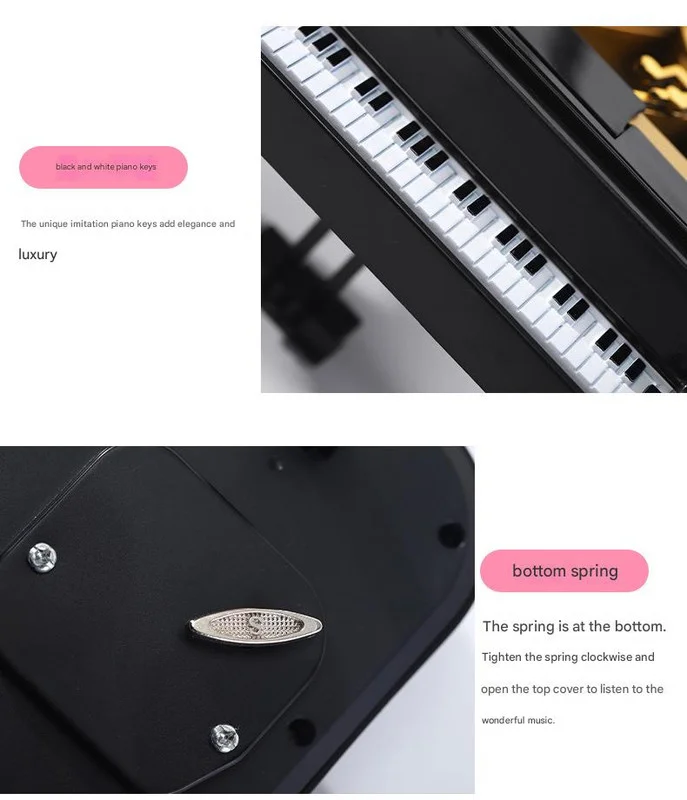 Experience the timeless charm of this exquisite Classical Grand Piano Music Box. This beautifully crafted miniature piano features an elegant design with intricate details, including a keyboard, pedals, and a prop-up lid with a clear viewing panel. When wound up, it plays a delightful melody while a graceful ballerina figurine twirls on top. The internal mechanism, visible through the clear panel and an opening in the piano body, showcases a "Piano Recital MUSICALE" design. Made with attention to detail, this mechanical music box requires no batteries. It serves as a wonderful decorative piece, a thoughtful gift for music lovers, ballet enthusiasts, or a charming addition to any collection. Presented in "The Classical Piano" gift box, it's ready to delight.