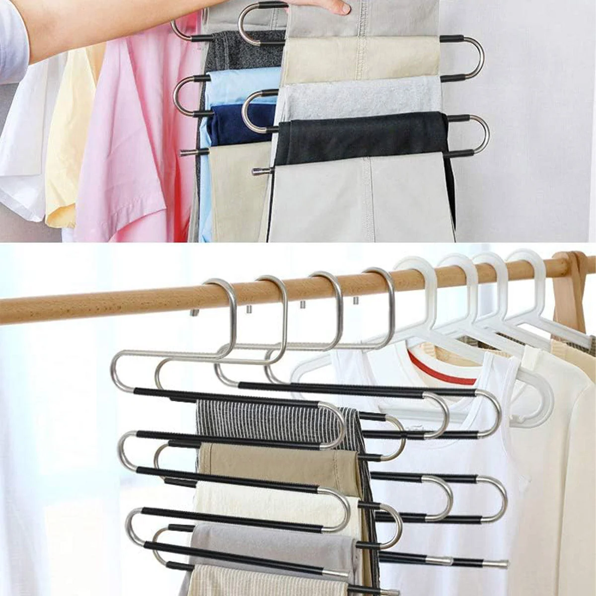 Organise your wardrobe efficiently with this set of four S-shaped stainless steel hangers.Each hanger features a 5-tier structure designed to maximise storage while keeping trousers, scarves, or towels crease-free and accessible.The anti-slip rubber coating ensures garments stay in place, while the durable stainless steel construction provides reliable support.Suitable for both vertical and horizontal use, these compact hangers are perfect for maximising space in small wardrobes or travel.