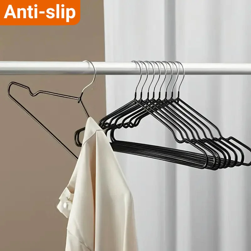 Keep your wardrobe organised with this 10-piece set of non-slip clothes hangers. Made from high-manganese steel and coated with seamless dipped PVC, these hangers are built to support heavy garments while preventing slippage or creasing. The special shoulder notches help maintain the shape of strappy clothing, while the rust-resistant coating ensures suitability for both dry and wet use. Durable and practical, they are perfect for daily storage in wardrobes, closets, or laundry rooms.