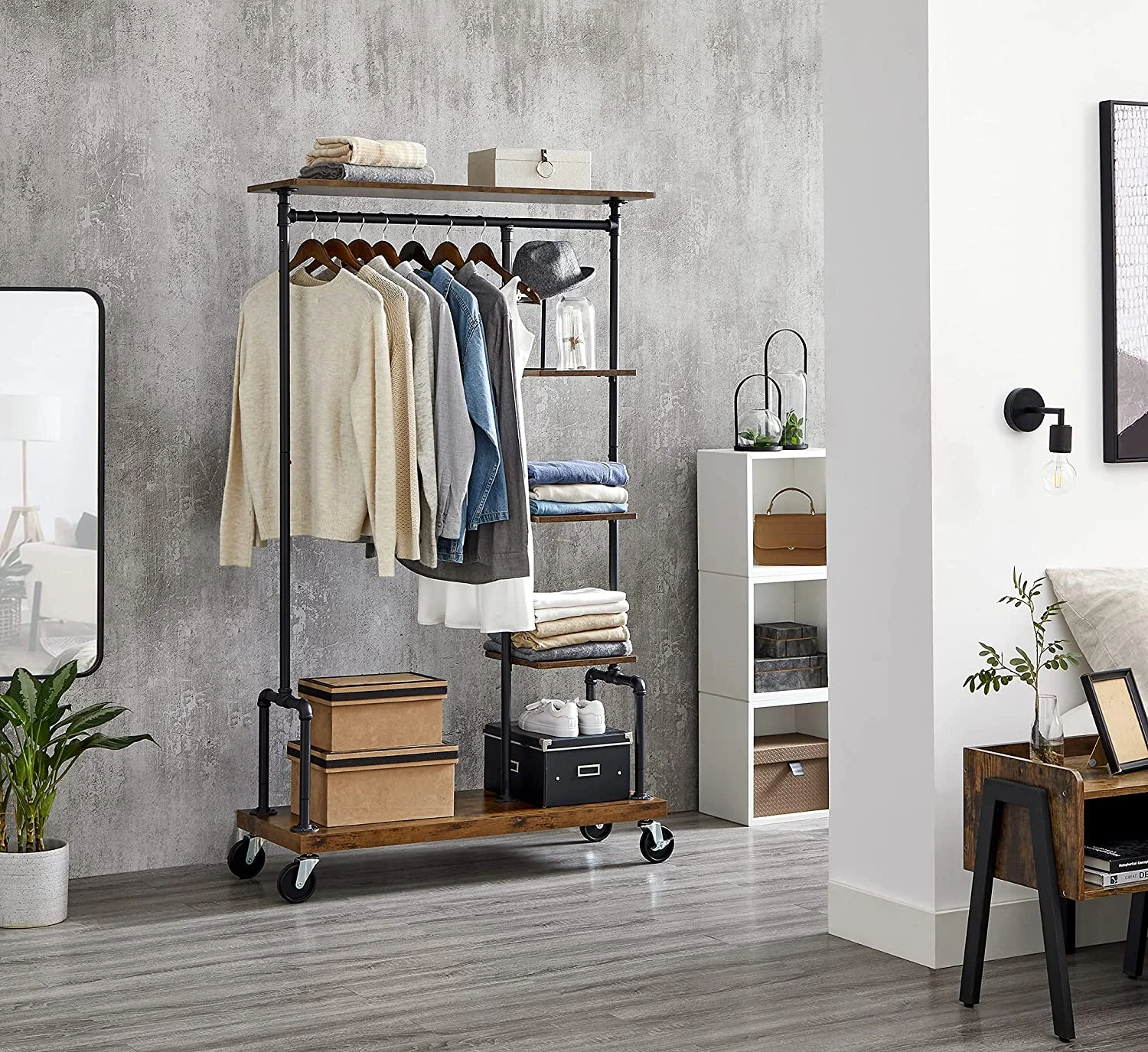 Clothing Garment Rack on Wheels with 5-Tier, Industrial Pipe Style, Rustic Brown