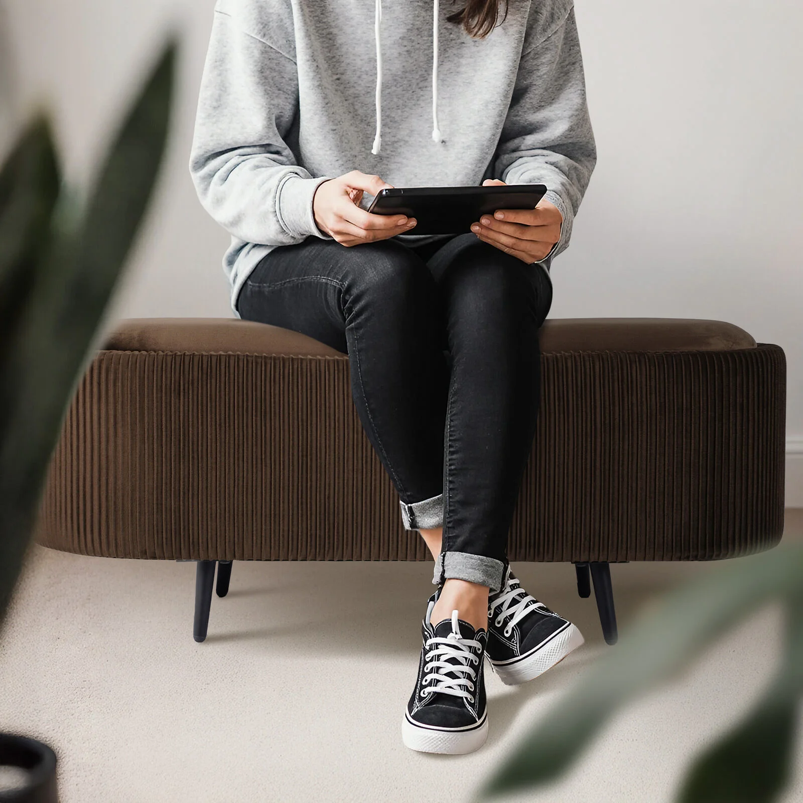 Its smooth black metal legs bring a sleek, modern edge, making it a standout in any living room, bedroom, or hallway. Floor-friendly pads protect your surfaces, and it?s quick to set up right out of the box. Practical, pretty, and perfectly versatile.