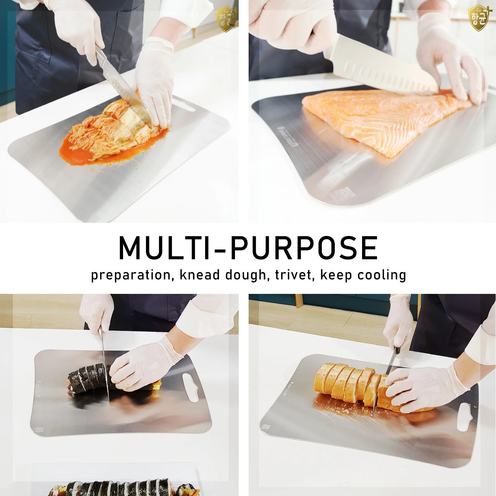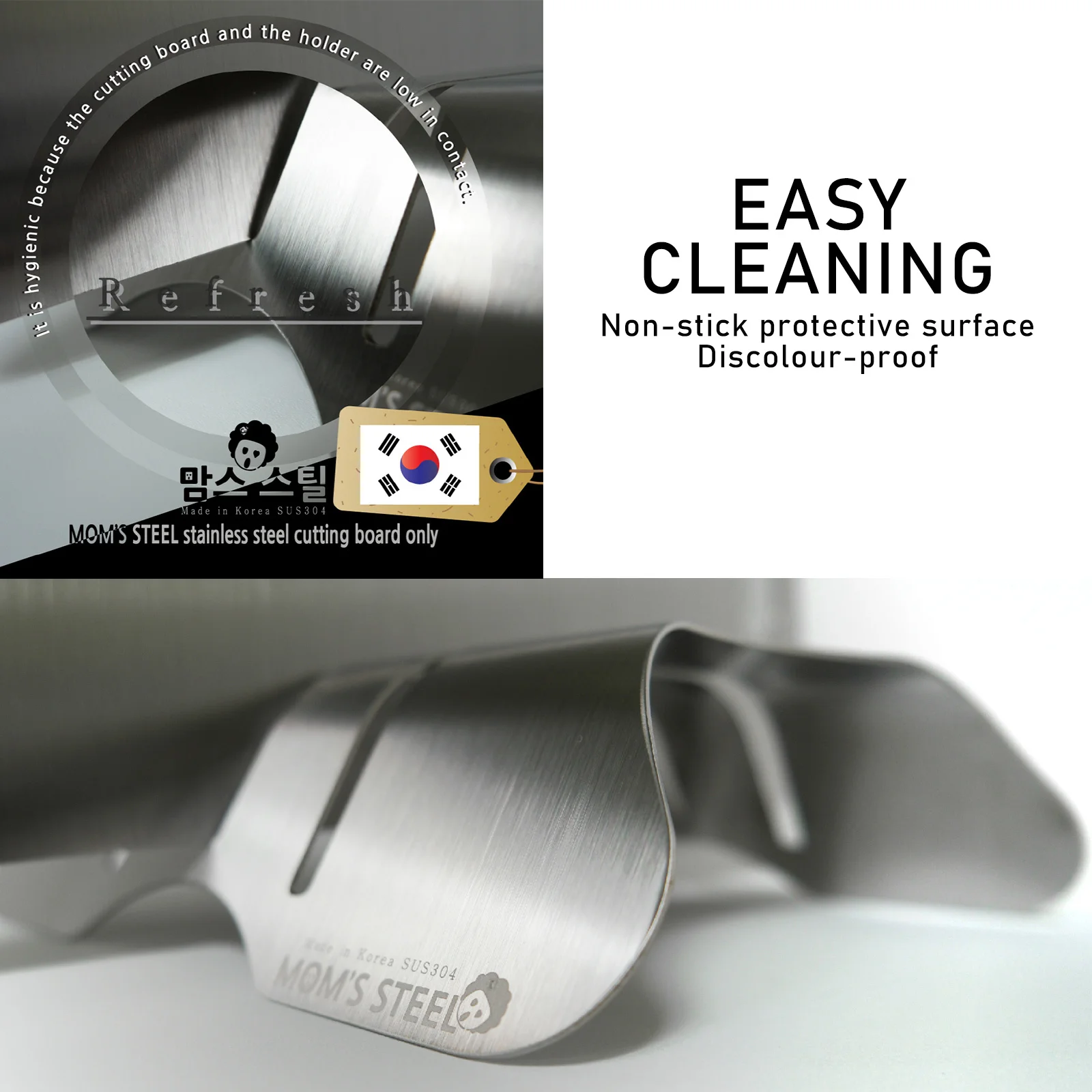 MOM'S STEEL "Antibacterial + Stainless Steel 304" Cutting Board is made in Korea. It is a top trending quality health and wellness product that is hygienic and lifelong. It provides antibacterial on both sides of surfaces for food preparation and presentation.