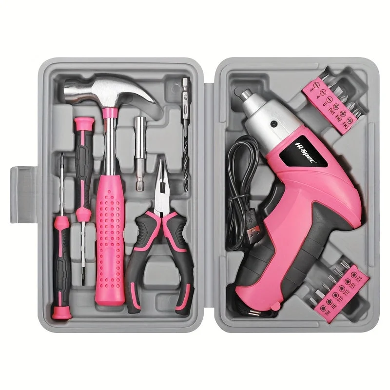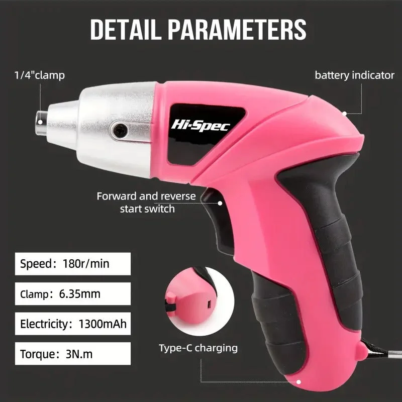 The Pink Cordless 3.6V Electric Screwdriver Tool Set is designed for basic home repairs and everyday use. Its compact, portable size makes it easy to store and handle. The USB-powered lithium battery ensures a reliable, cordless experience for efficient repairs anywhere in your home.