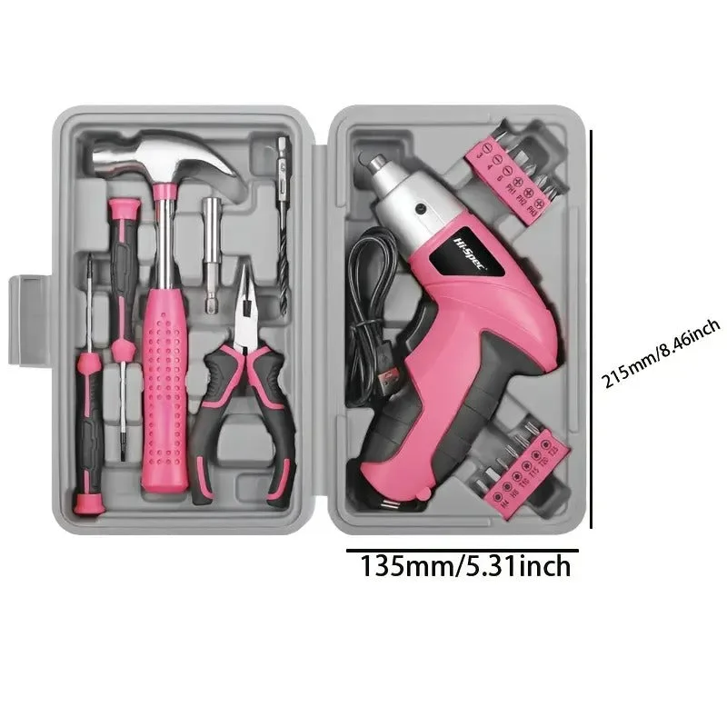 Compact rechargeable pink tool set perfect for home repairs.
